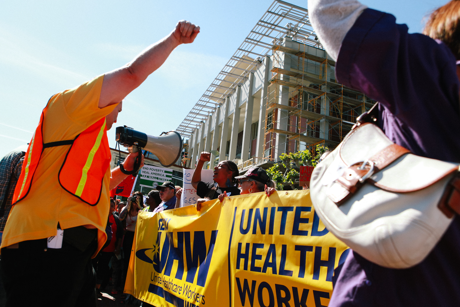By 3 p.m., contingents of workers from Oakland and Richmond had marched and bussed to the UC Berkeley campus to participate in a massive scheduled rally. The broad coalition of organizations present included East Bay Fast Food Workers, Service Employees International Union (SEIU), Alliance of Californians for Community Empowerment (ACCE), East Bay Alliance for a Sustainable Economy (EBASE), the California Faculty Association, the Sierra Club, Black Lives Matter, the Oakland Workers’ Collective, and Restaurant Opportunities Centers (ROC) United. The crowd also included low-wage workers from San Jose and Sacramento, and members of United Farm Workers from Salinas.