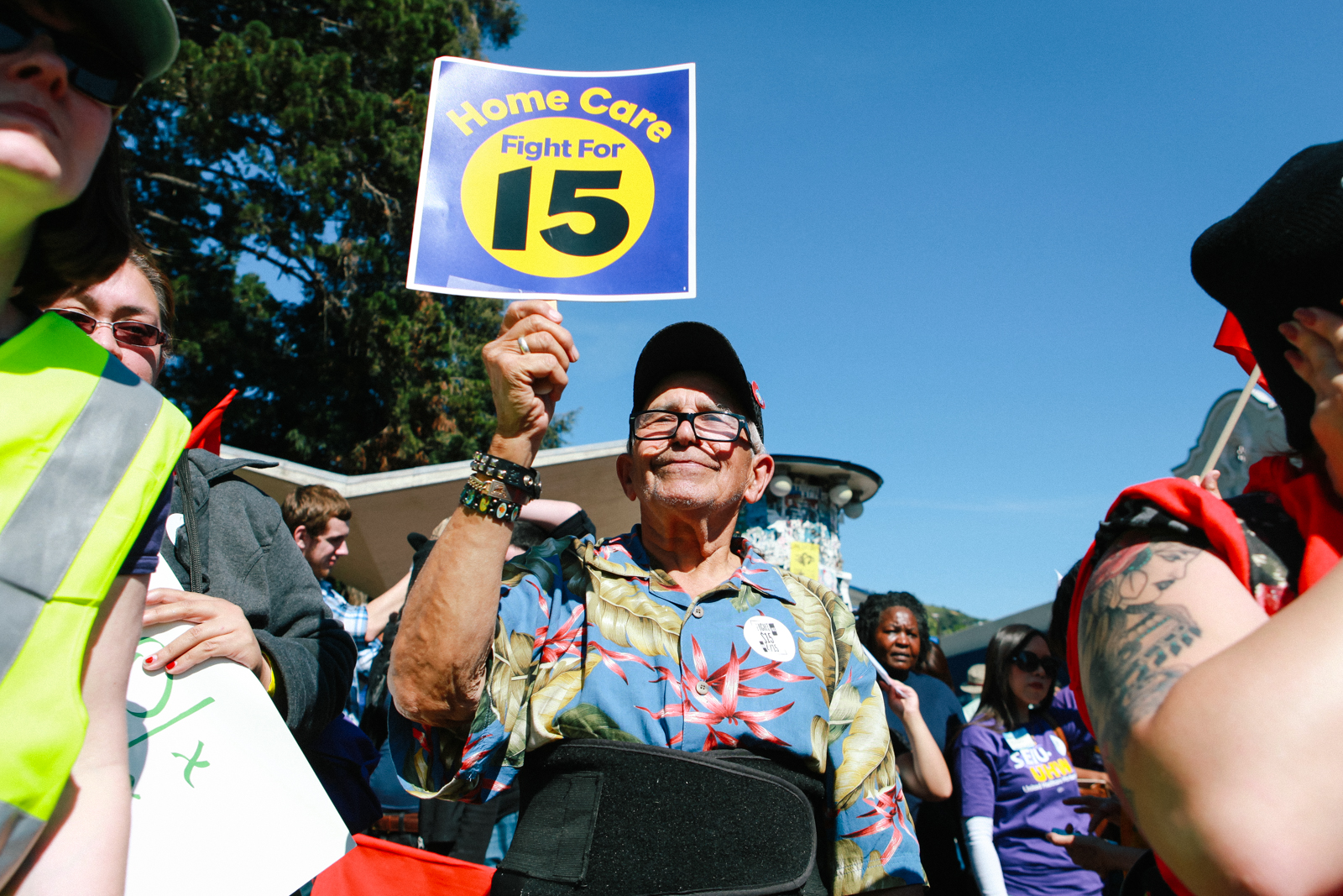 - Felipe Gonzalez, 85, of Oakland, shows his support for the “Fight for $15” at Sproul Plaza on the UC Berkeley campus. (Photo by Bonnie Chan)