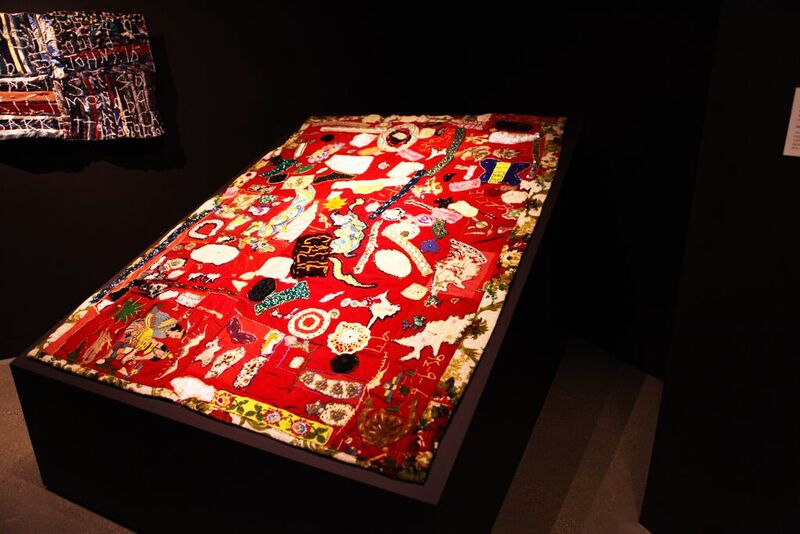 Another stand-out piece is Tompkins’ Unfinished, which associate curator Carin Adams says she worked on throughout her life. Tompkins used a lush red velvet as a background to a singular mix of patchwork. The piece includes beads, turquoise sequins, embroidered flowers—even a painting of maracas.