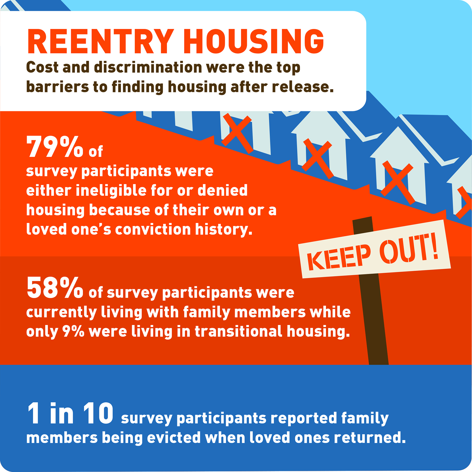 Family support is also essential due to the difficulties of finding housing after being incarcerated, the report’s writers concluded, finding that “58 percent of formerly incarcerated participants were currently living with family members,” and that “79 percent of participants were either ineligible for, or denied housing because of their own or a loved one’s conviction history.”