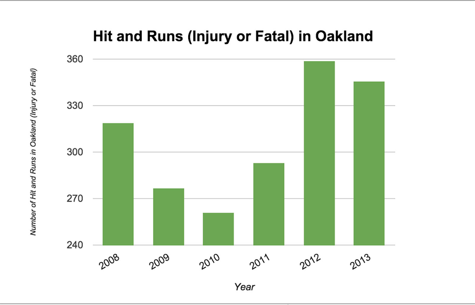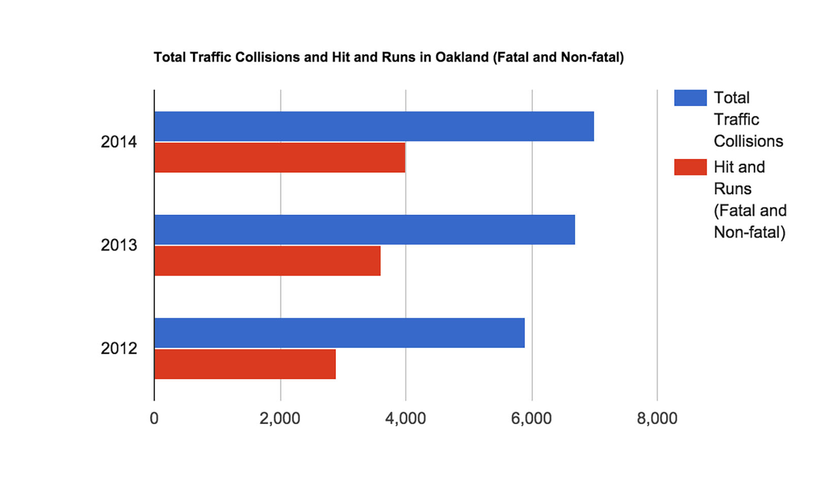 According to the California Office of Traffic Safety, a government agency that provides grants to local and state public agencies for programs to help them enforce traffic laws, Oakland has consistently had the highest rate of hit-and-run crashes of any large city in the state. “In 2014, there were 7,000 traffic collisions, of which 4,000 were hit and runs,” said Officer Glenn Hara, who works in the traffic investigation unit at the Oakland Police Department. Out of those cases, which include incidents with injuries and fatalities as well as more minor cases, such as damage to a parked car, OPD has solved fewer than 2 percent.