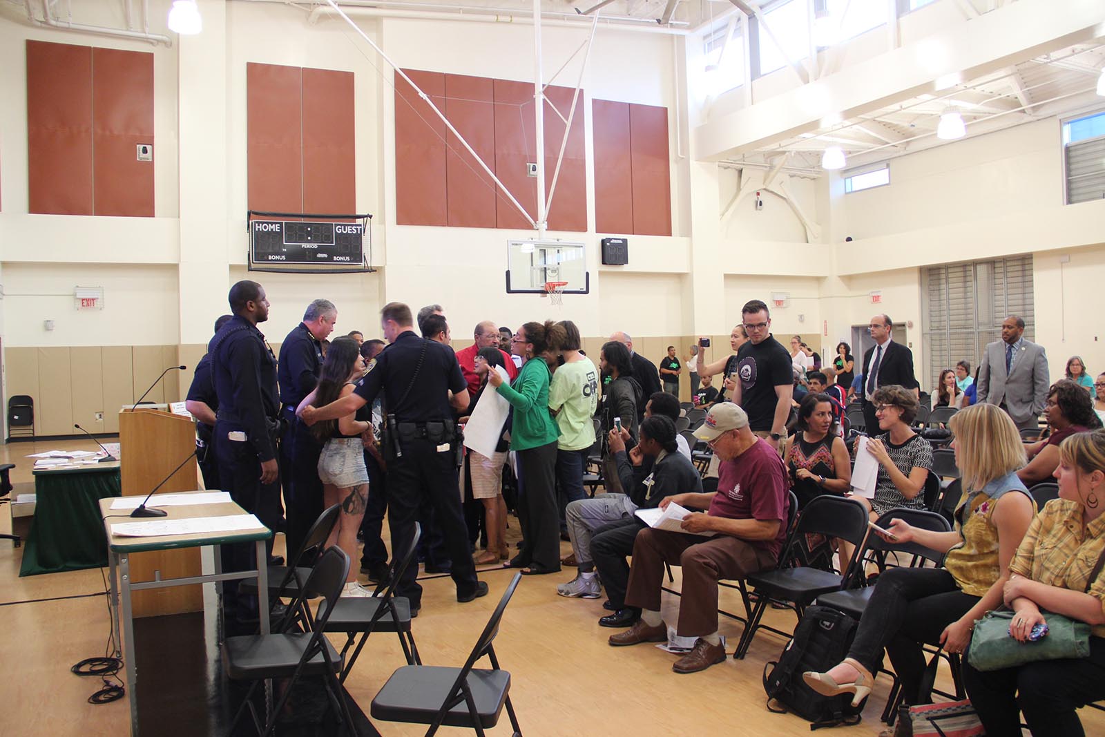 - The school board meeting came to a halt until public comments came to order. Photo by Erika Alvero.