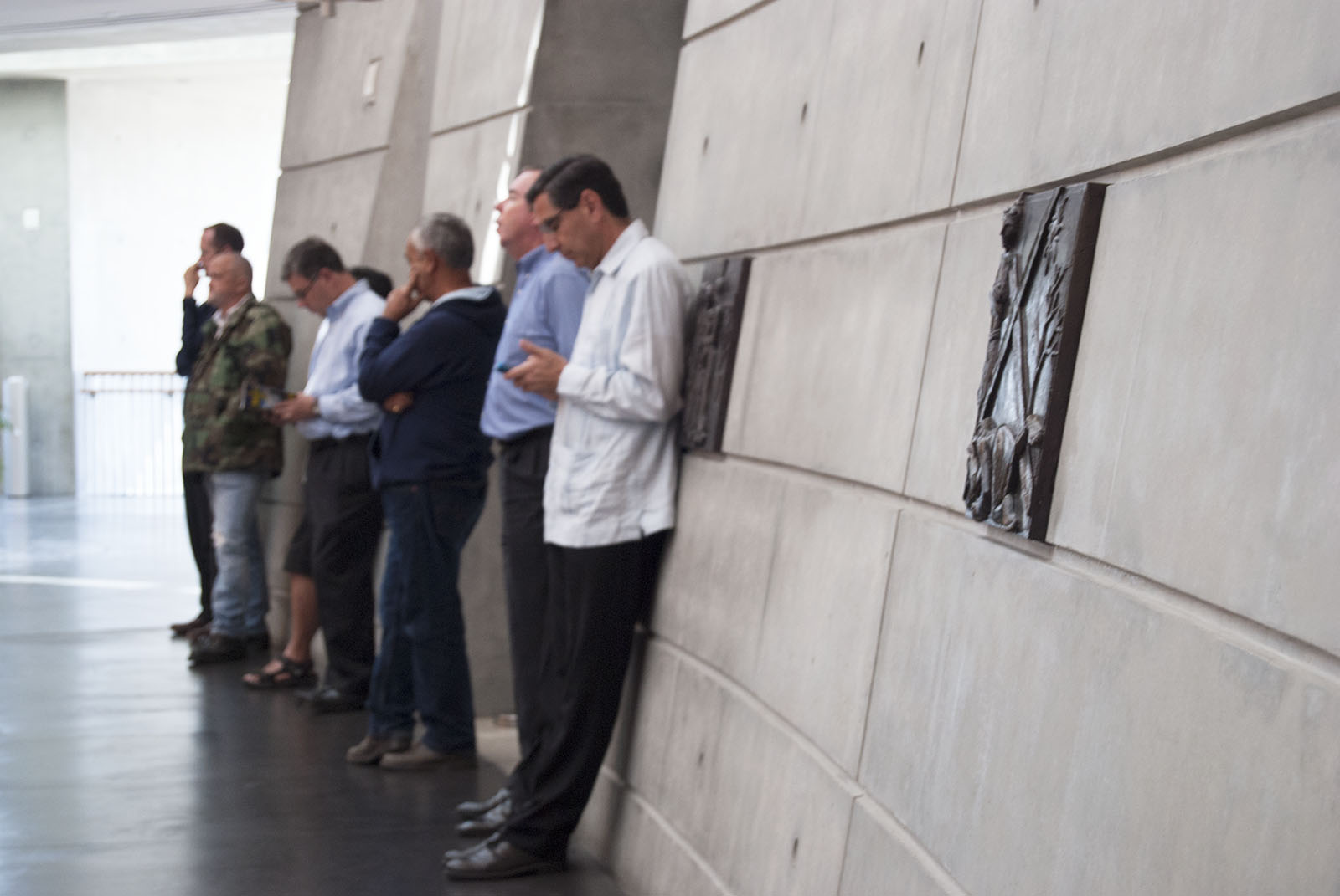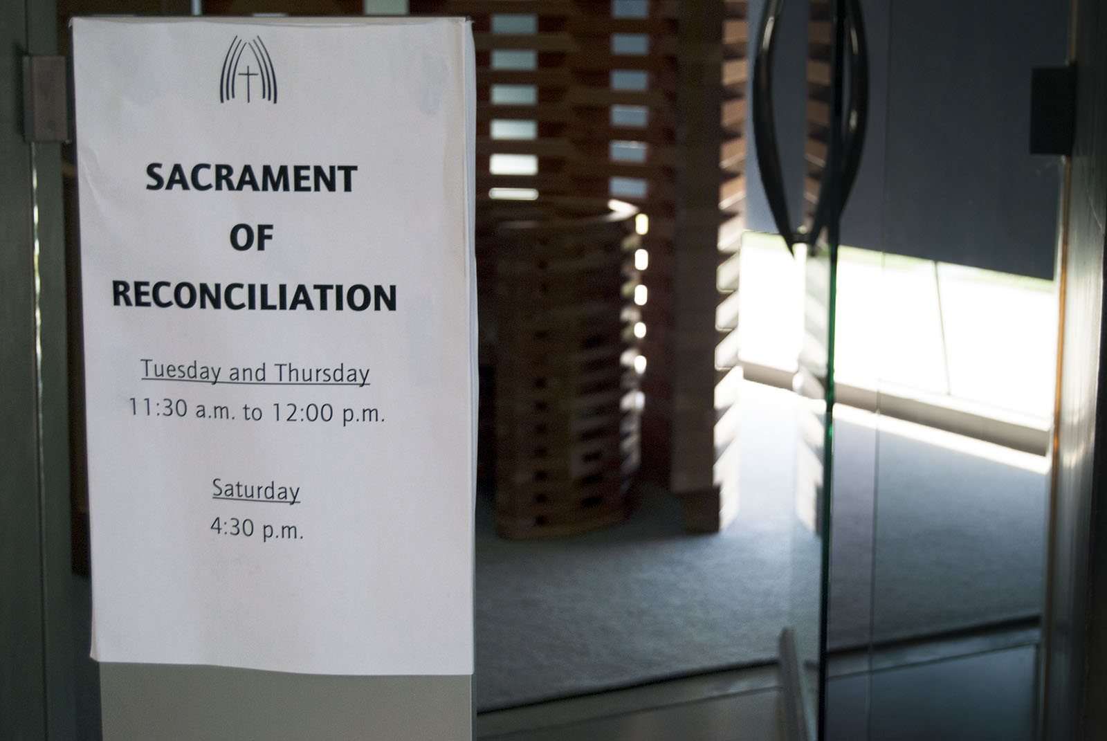 A gray-haired priest dressed in black and carrying a white garment enters the cathedral, bows, and speeds walks toward the altar. He walks up a small ramp and disappears behind the wooden panels that surround the cathedral. A few moments later, he appears again, now wearing the white garment and with a lilac stole hanging around his neck. The priest walks past the growing line of people leaning against the cement wall and the first man in line follows him past a glass door. The remaining people scoot forward a few steps toward the door. A man holds onto his rosary beads and the rest wait with blank stares in their eyes as, one by one, they are called to confession.