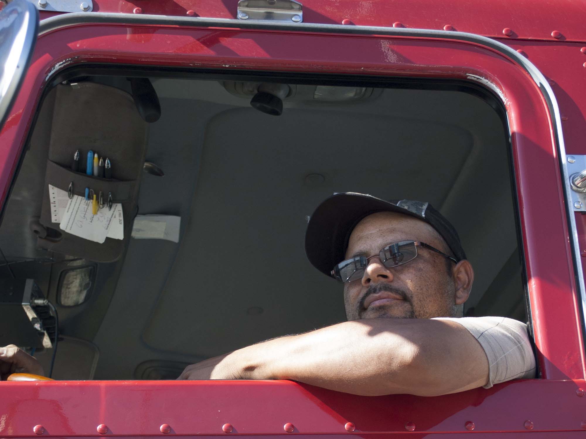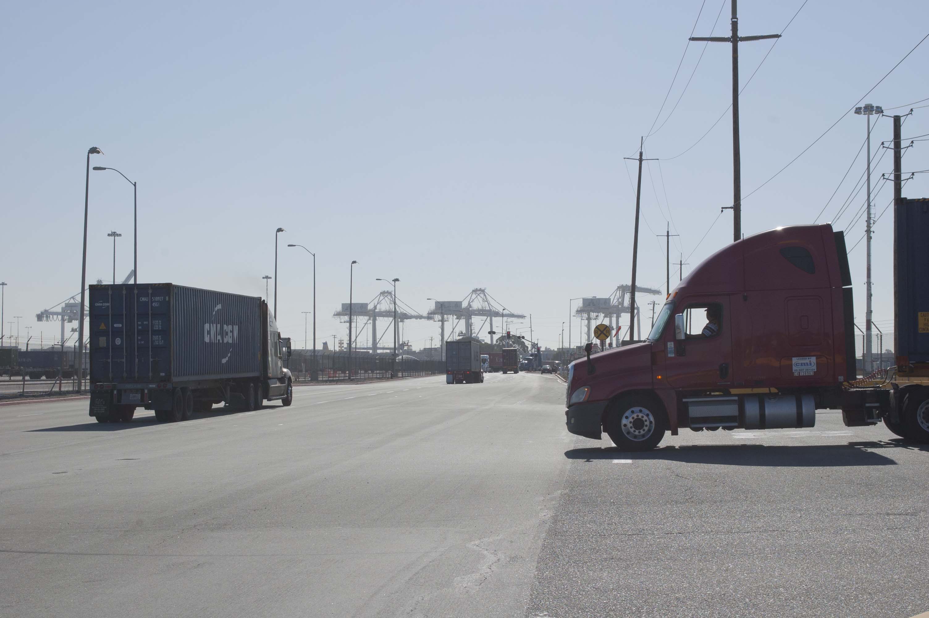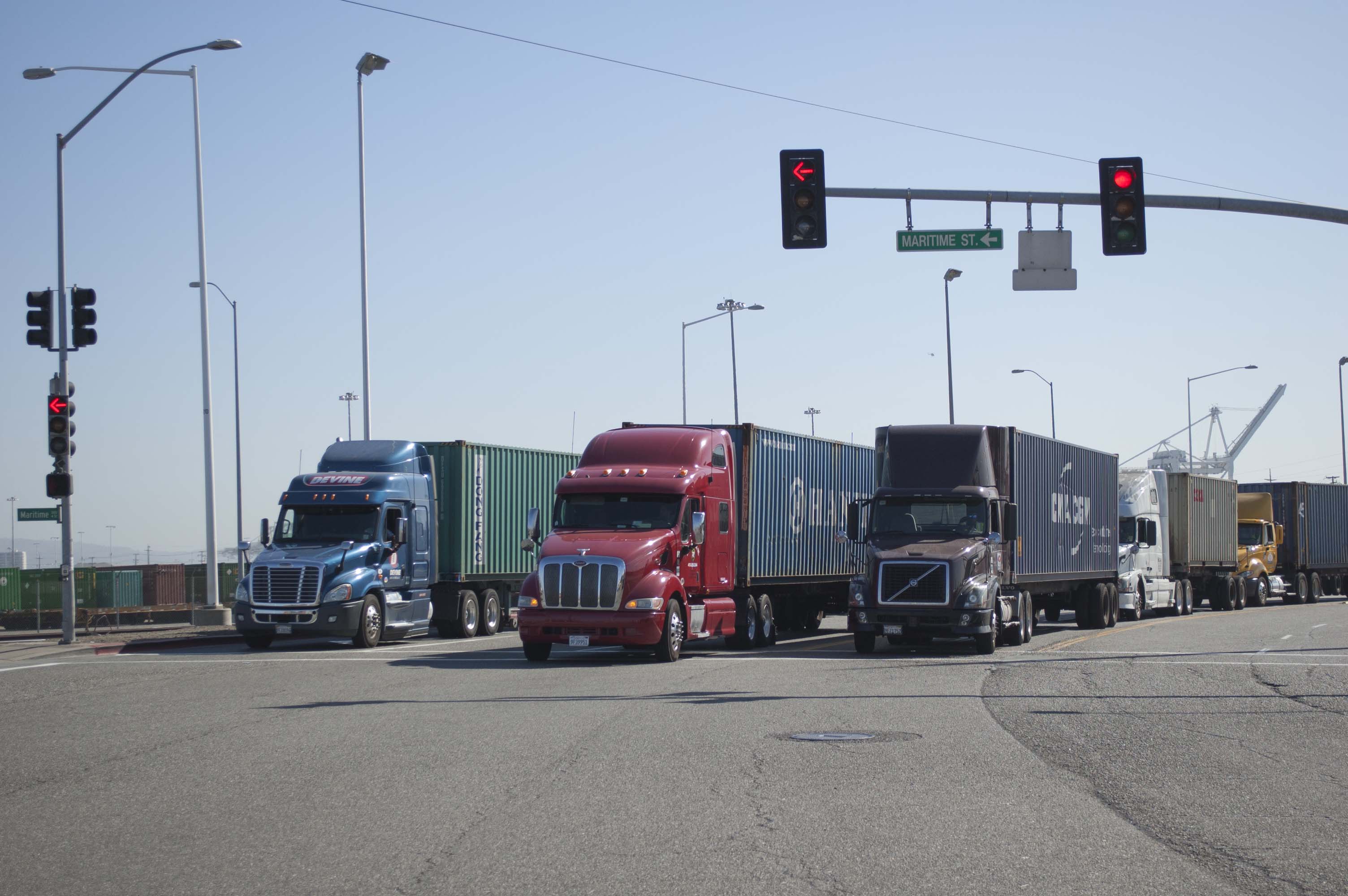 Santiago Diaz, from Woodland, CA, is perched in his truck cabin, well behind the antsy truck drivers angrily laying on their horns for one, two, three, thirty seconds. They are urging the drivers at the front to make an aggressive move through the four-way stop sign that manages the entrance to the SSA Marine Terminal. The big rigs lurch at each other like gladiators. Diaz is resigned to the wait. “Its usually takes two hours,” he says.
