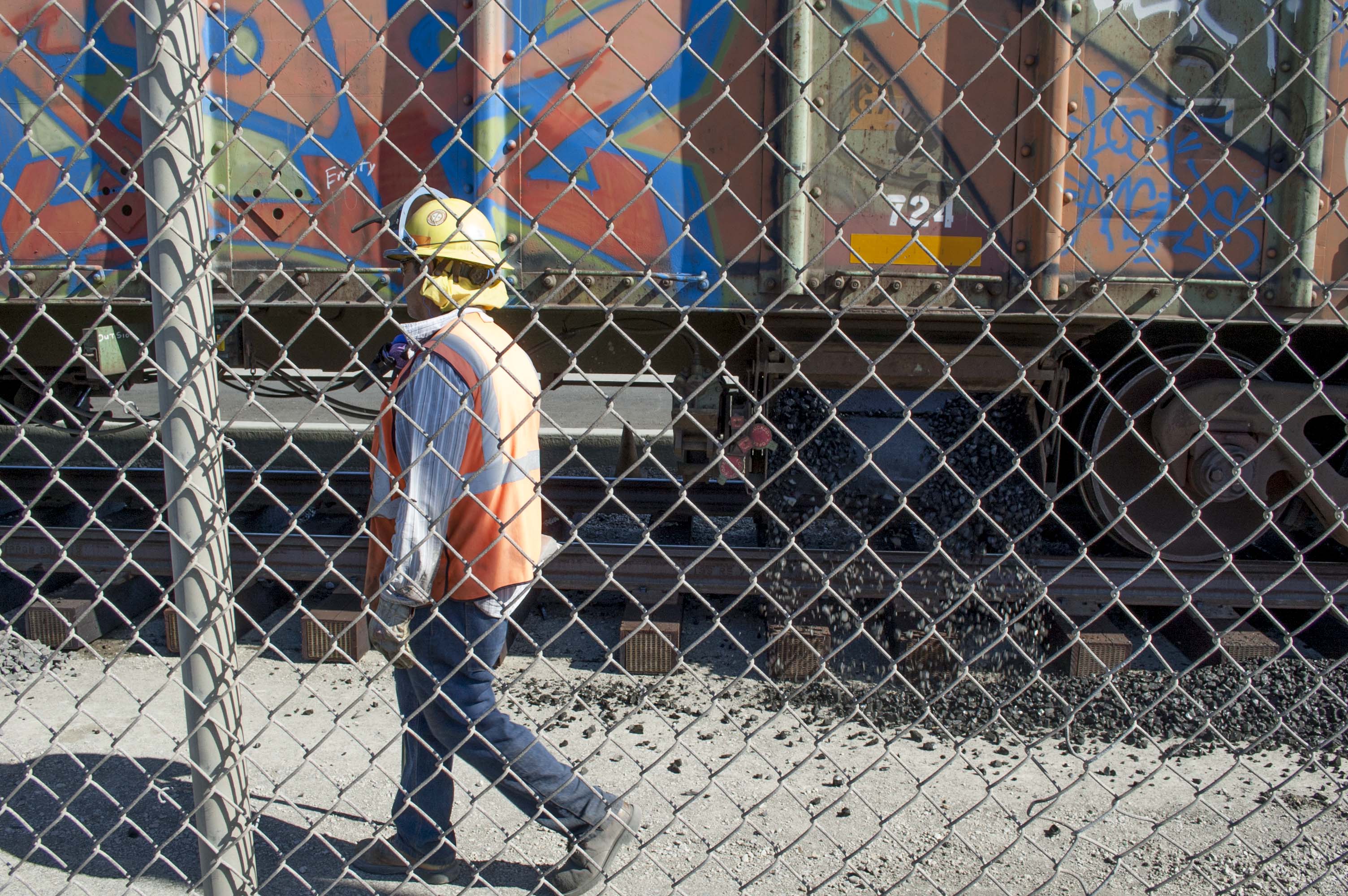- A worker helps sluice heavy shale on to brand new railroad tracks that will serve the freight yard at the Port of Oakland.