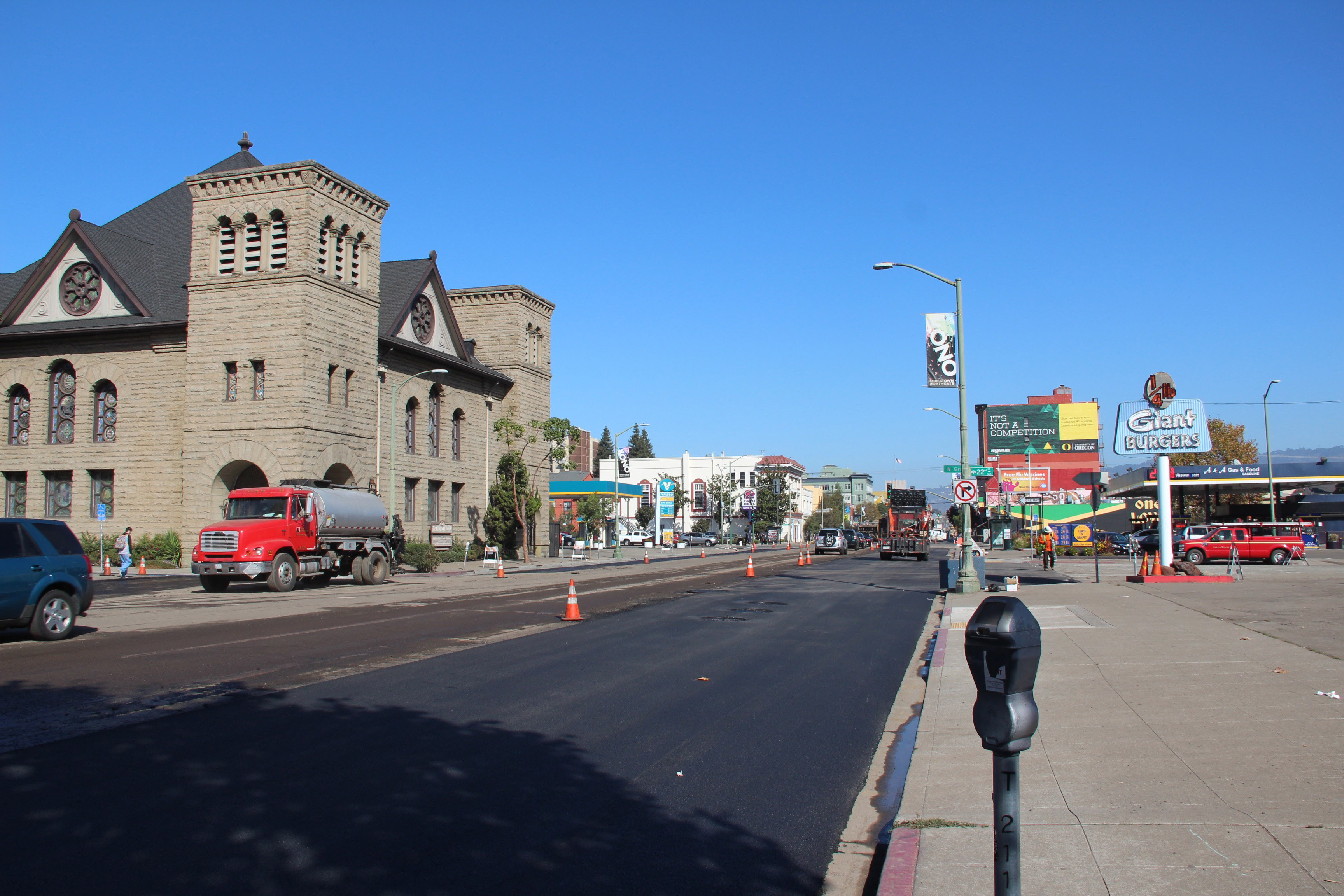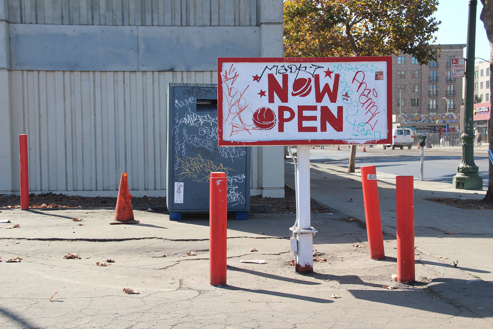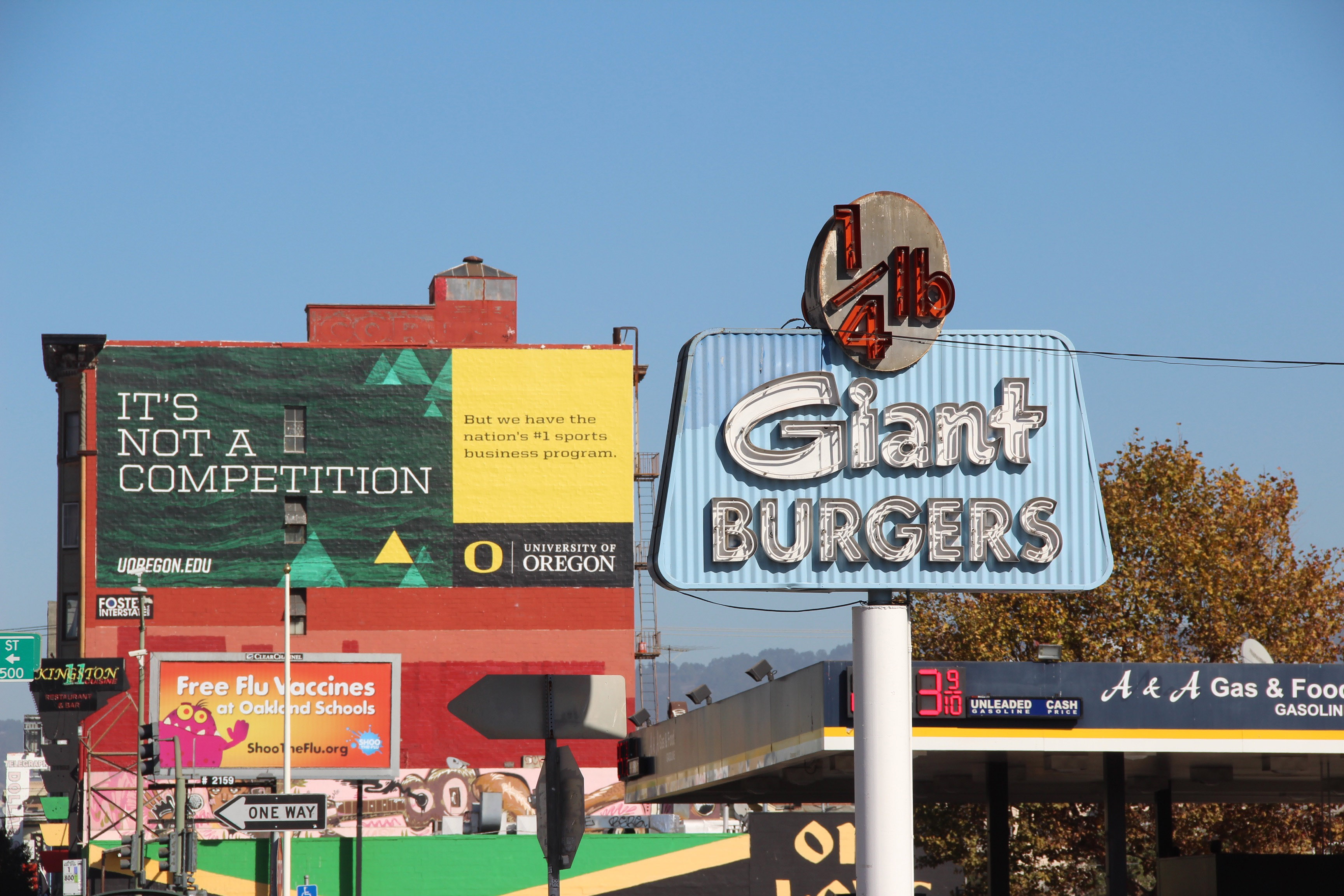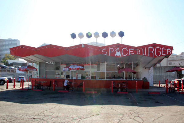 Greetings from Space Burger, a red and white striped shrine to fifties kitsch. Official people would call this the 2200 block of Telegraph. Space Burger’s set between two gas stations and sits next to the kind of street sweeping machine a person can sit inside. There’s a church across the street and, from the hours of 11 am to noon on October 22, 2015, none of its bells rang.