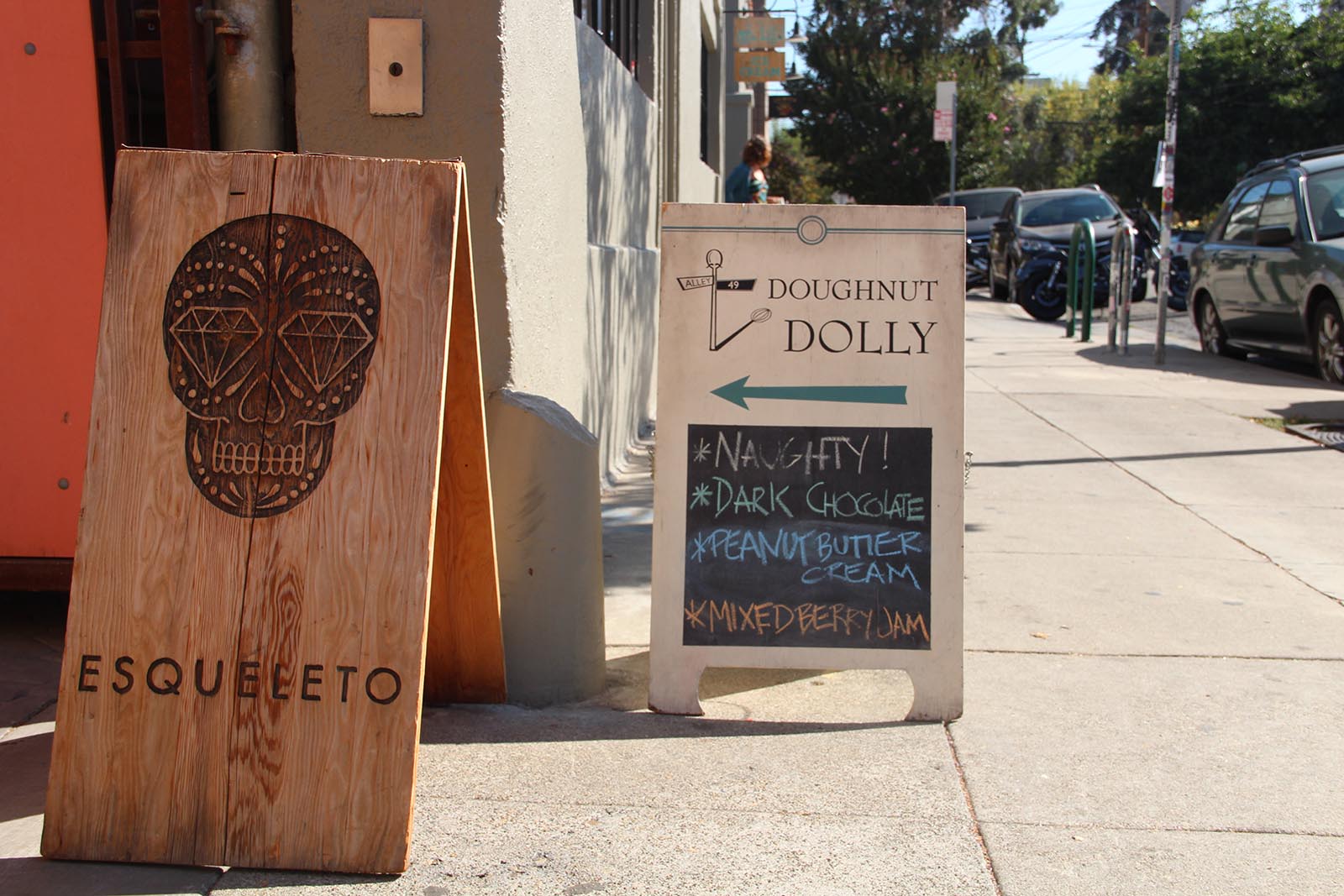 - Signs for Doughnut Dolly and Esqueleto, two of the businesses located in Temescal Alley.