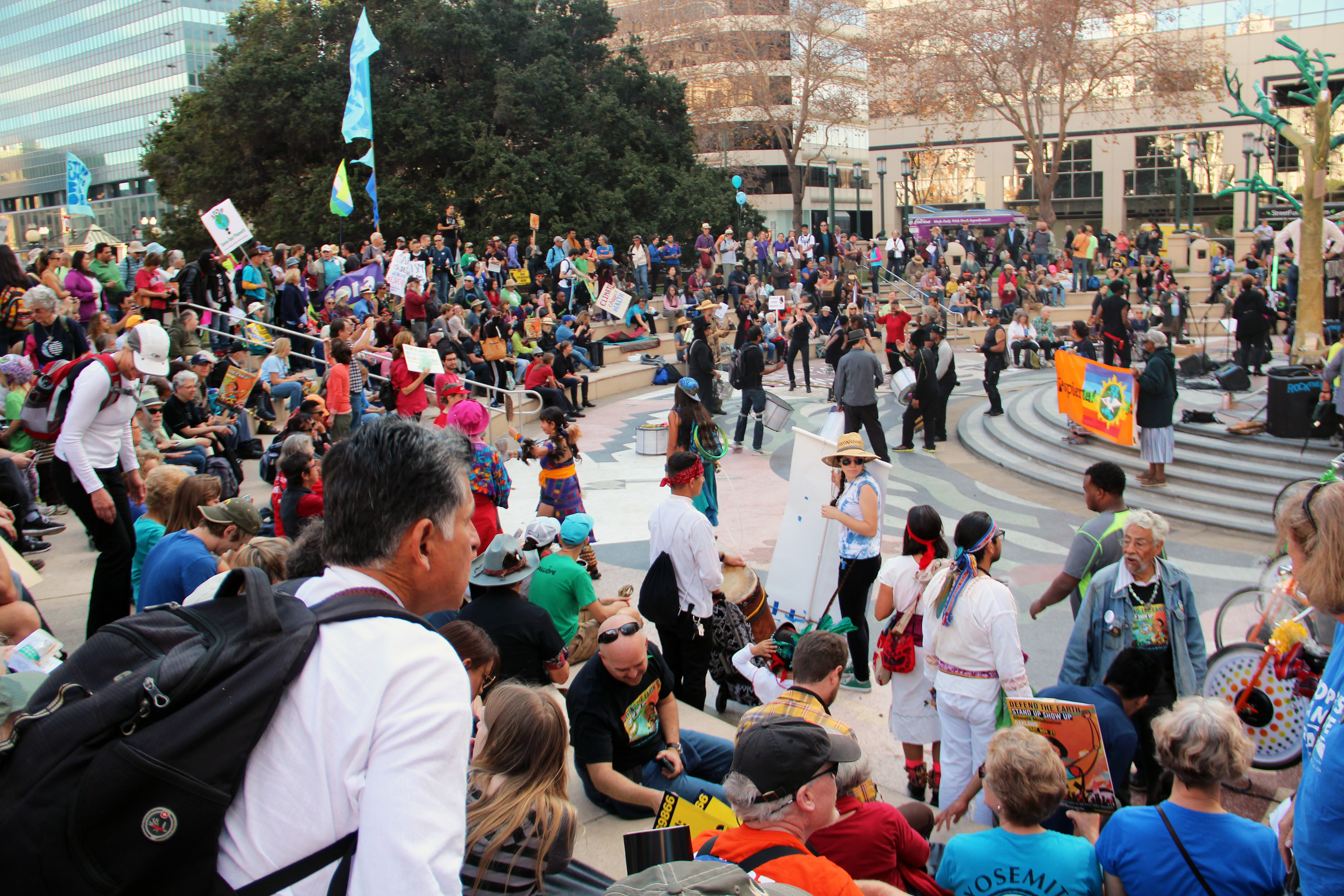 Thousands of people marched last Saturday in Oakland to demand political action on climate change and a global reduction in fossil fuels in advance of the global climate conference in Paris. The crowd, estimated at more than 4,000, marched from Lake Merritt to Frank Ogawa Plaza. Drummers and dancers entertained the crowd while local speakers highlighted the major challenges to reducing global warming.