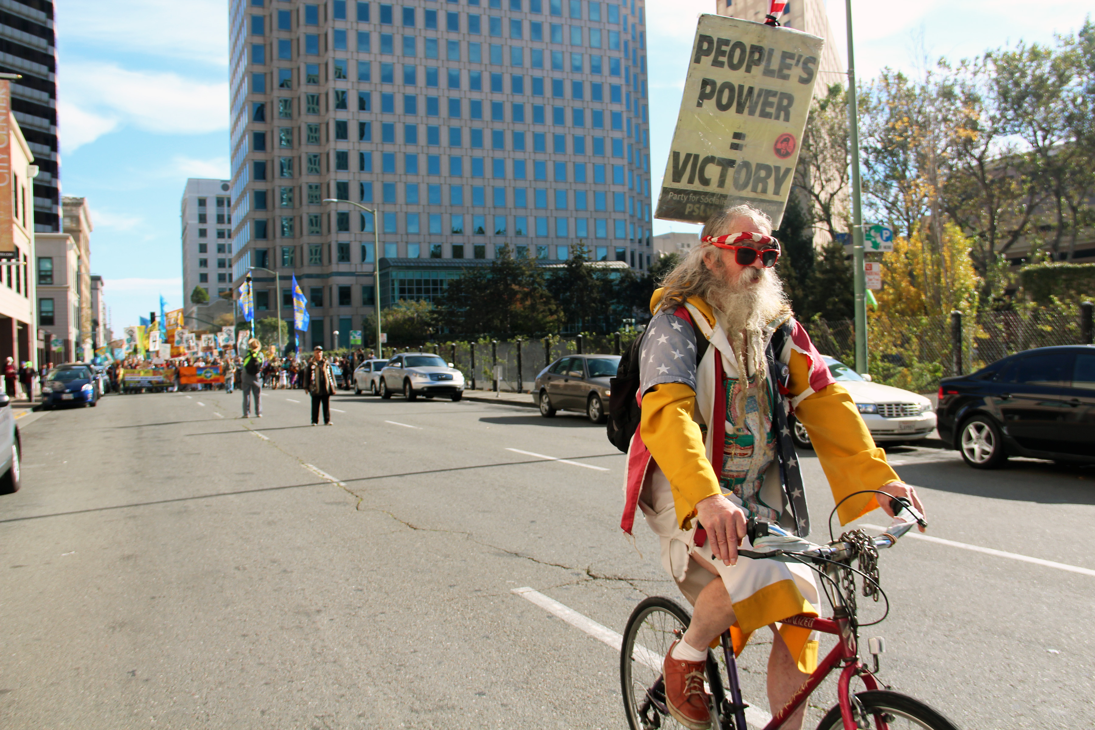 - People march towards Frank Ogawa Park participating in the NorCal Climate Mobilization Nov. 21 in Oakland. Photo by Jennifer Glenfield.