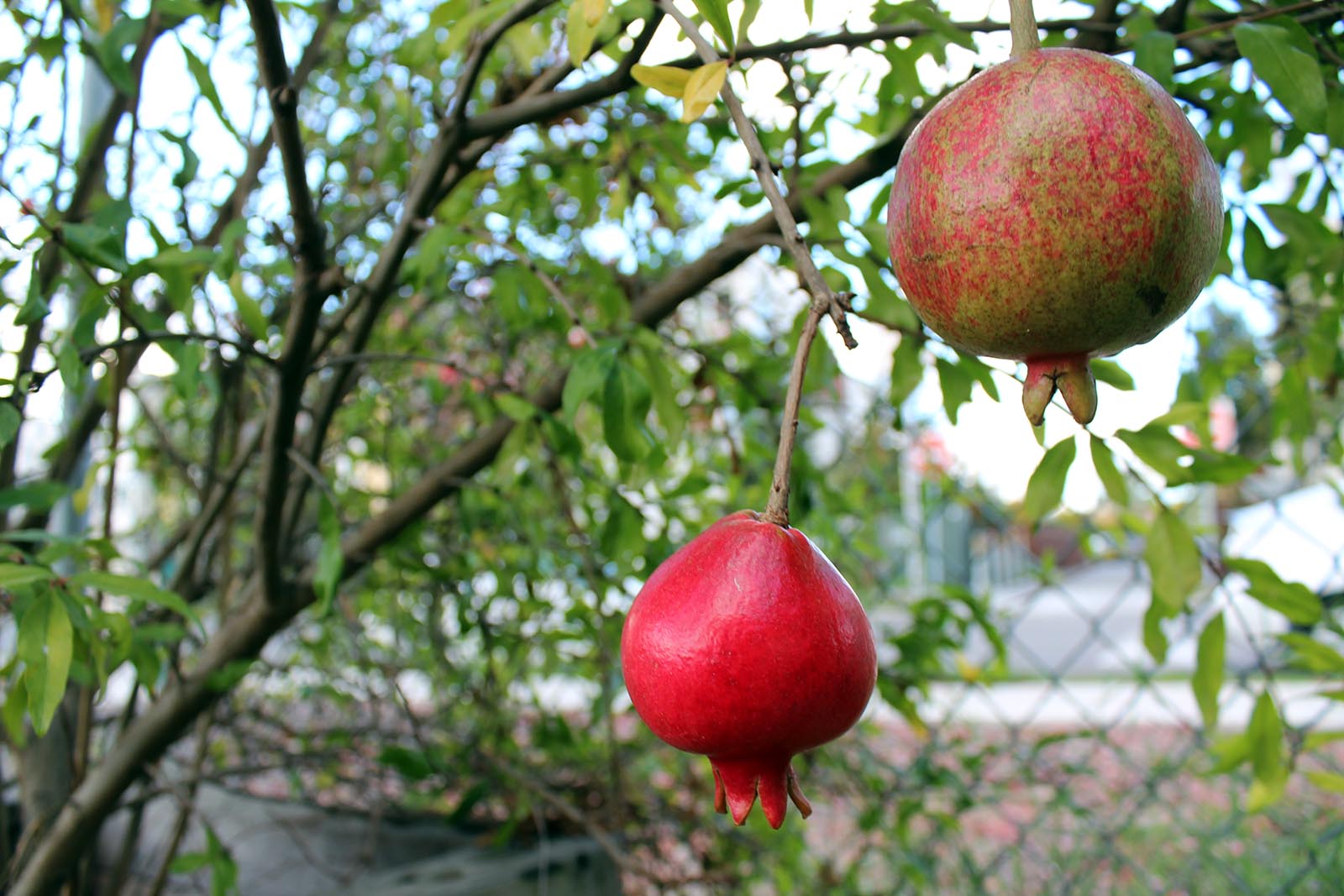 - Two ripe pomegranates dangle in the crisp autumn air at Acta Non verba Farm in Oakland.