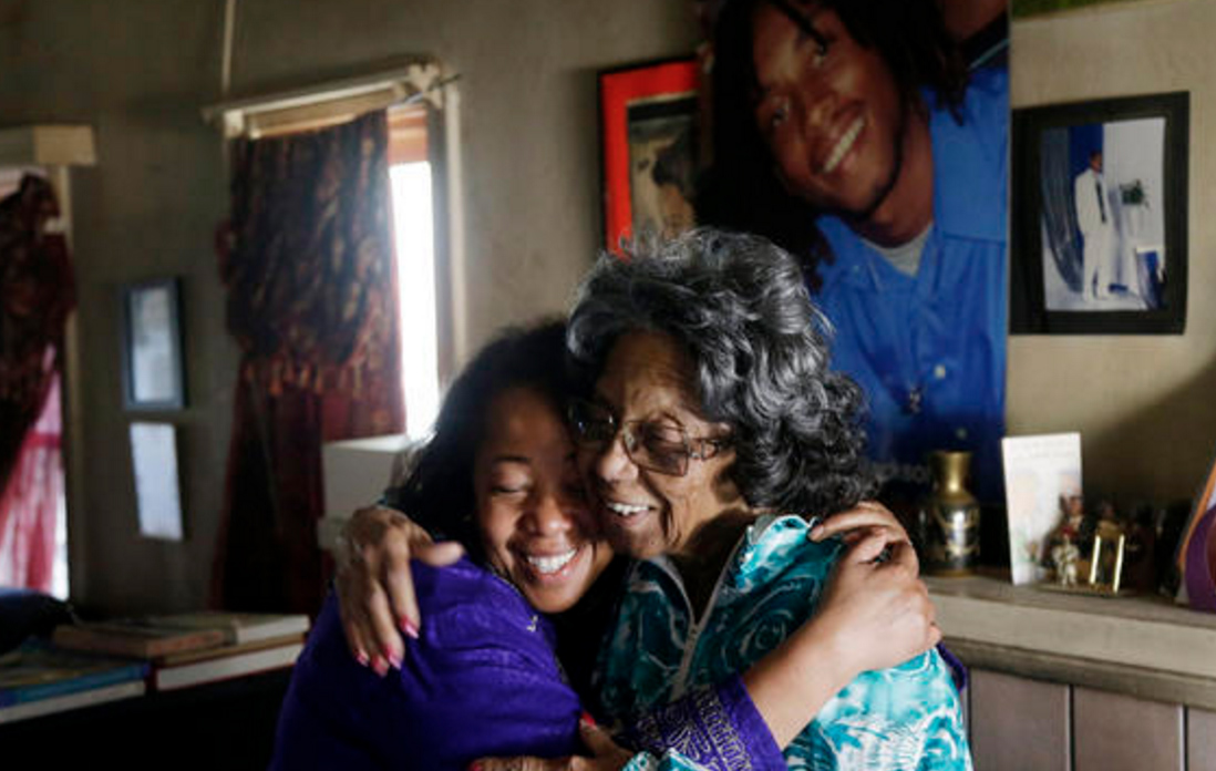 - In this Dec. 23, 2014 photo, Lorrain Taylor, left, hugs Arlene Johnson, grandmother of Diamond Jackson, who was shot and killed in his neighborhood in 2009, in Oakland, Calif. Taylor was paying a visit to Jackson’s family as part of her duties for the nonprofit 1000 Mothers To Prevent Violence. (Photo courtesy of Marcio Jose Sanchez)