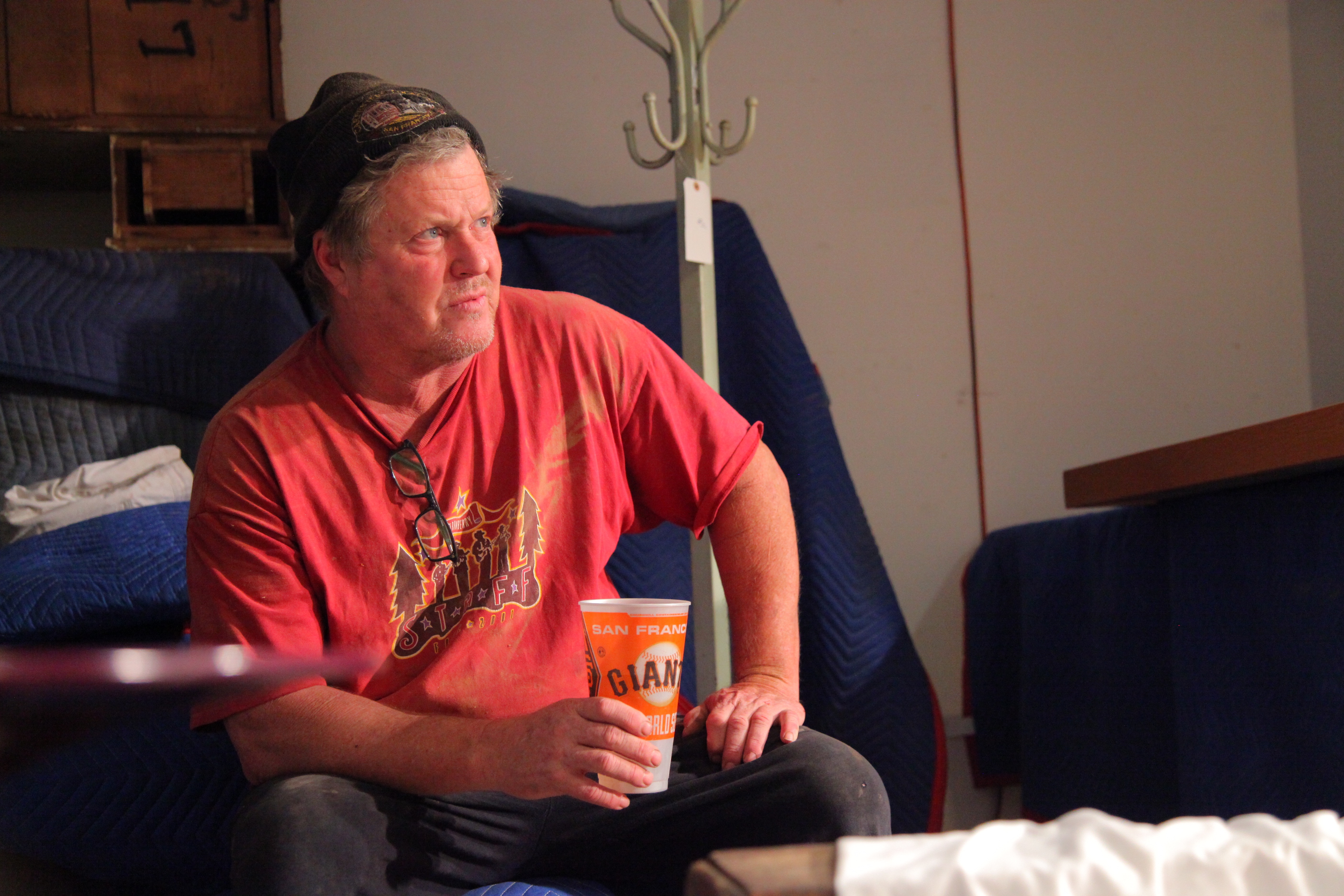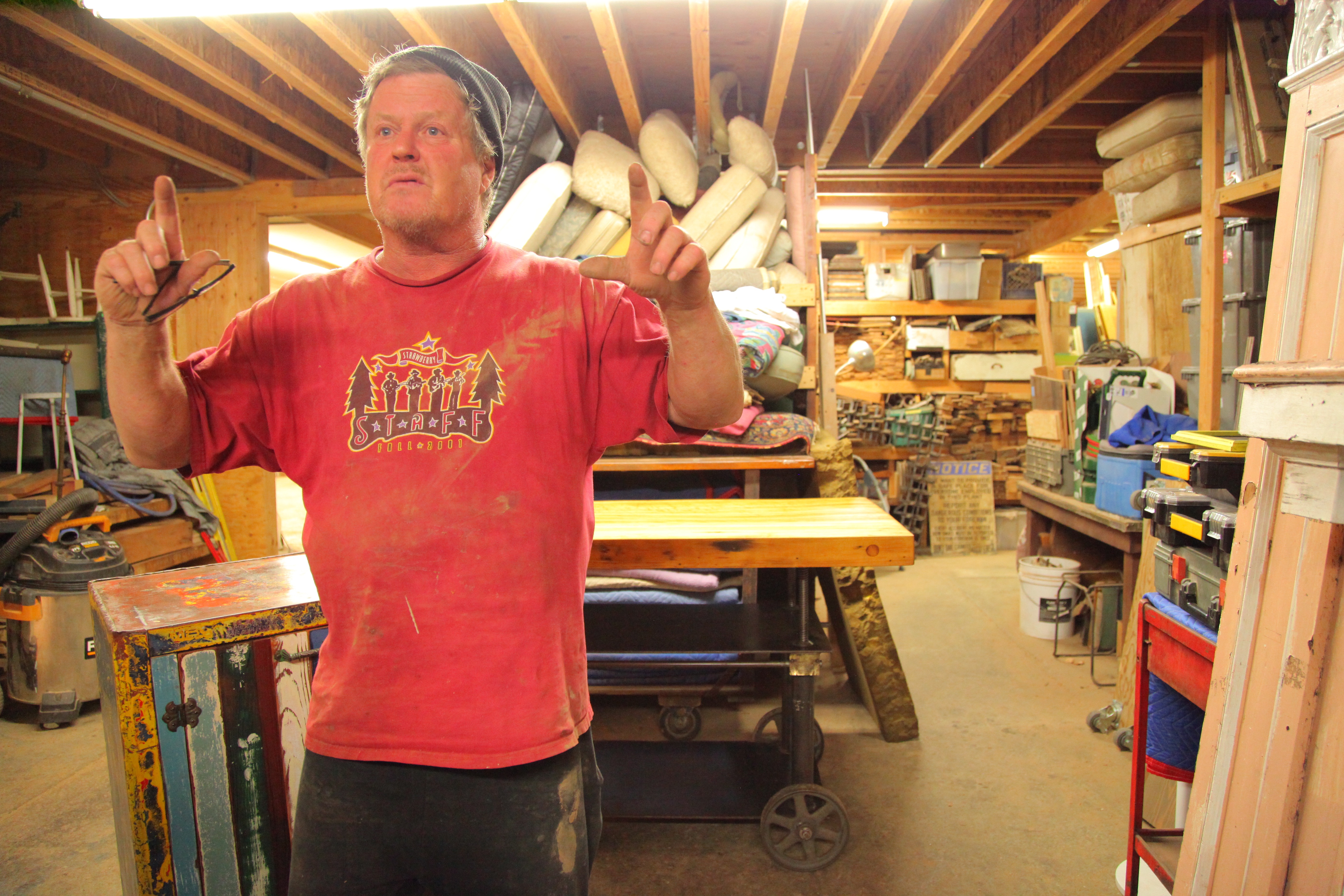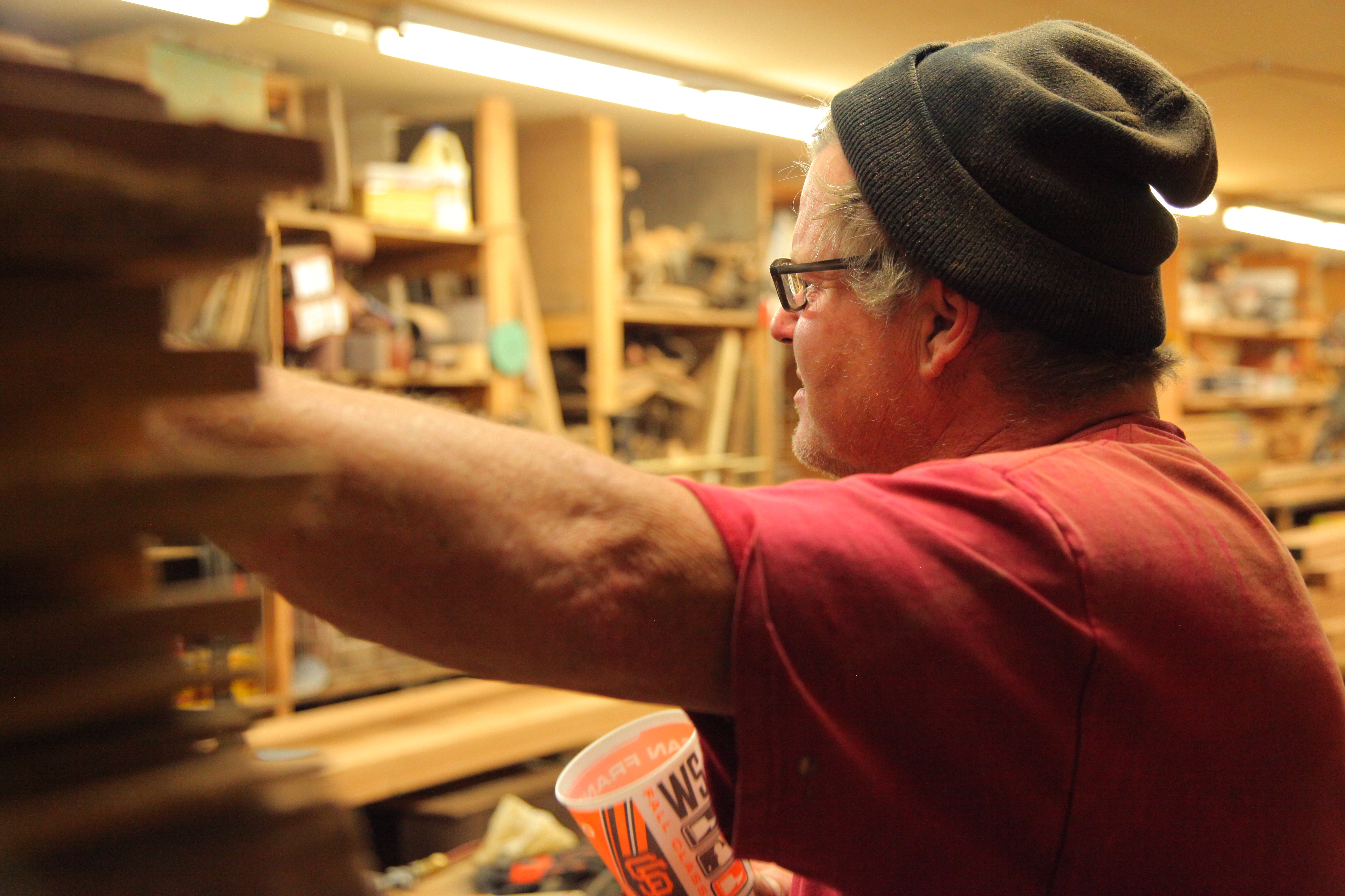 He’s covered head to toe in a thick skin of sawdust and there is black embedded under his fingernails. His eyes are clear blue and one gets the impression that he’s never worn sunscreen. He sports a staff t-shirt from the 2001 Strawberry Music Festival and a black “SF” beanie like the ones tourists buy at Fisherman’s Wharf. The 20-ounce plastic 49ers cup he’s holding is apparently a mainstay accessory.