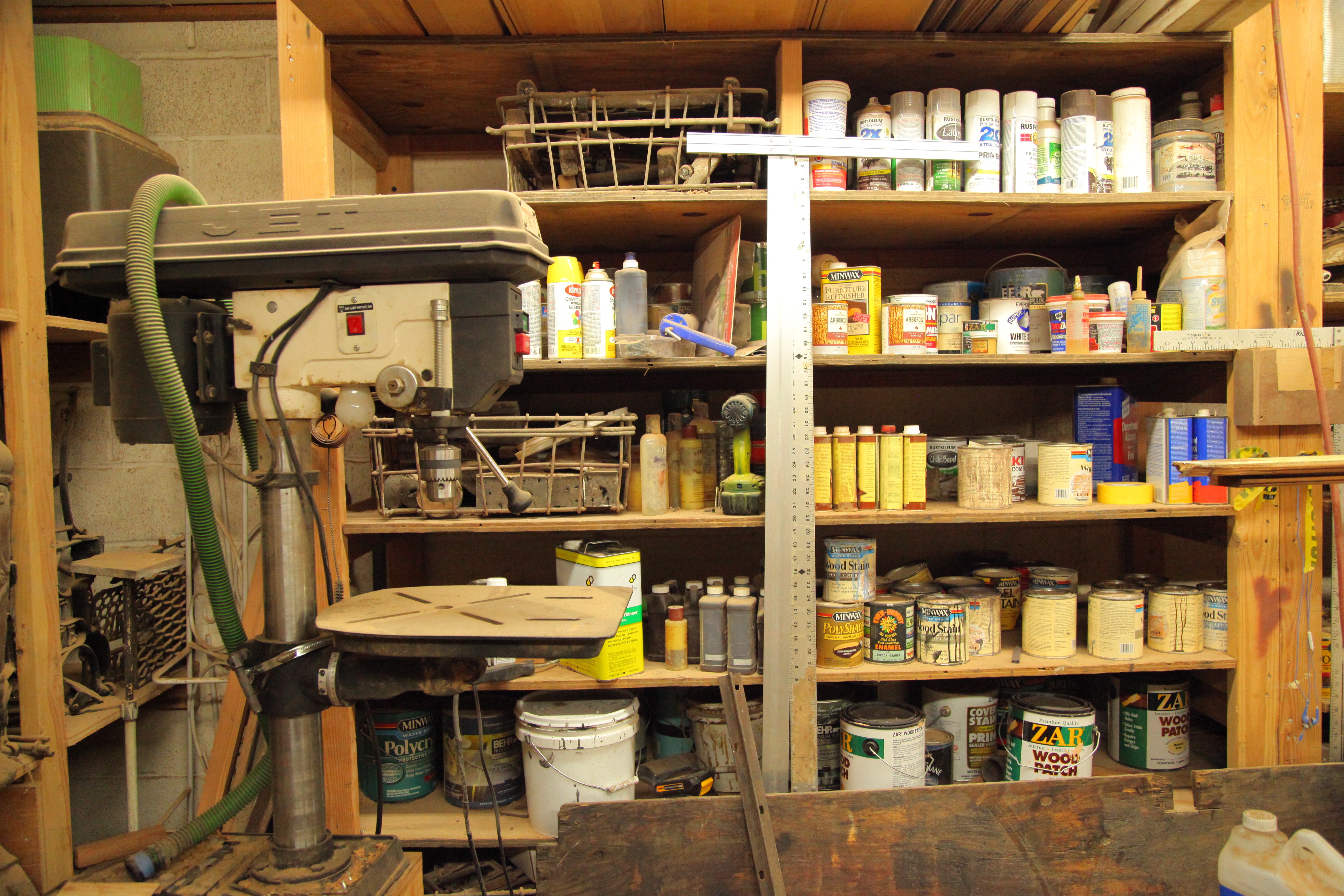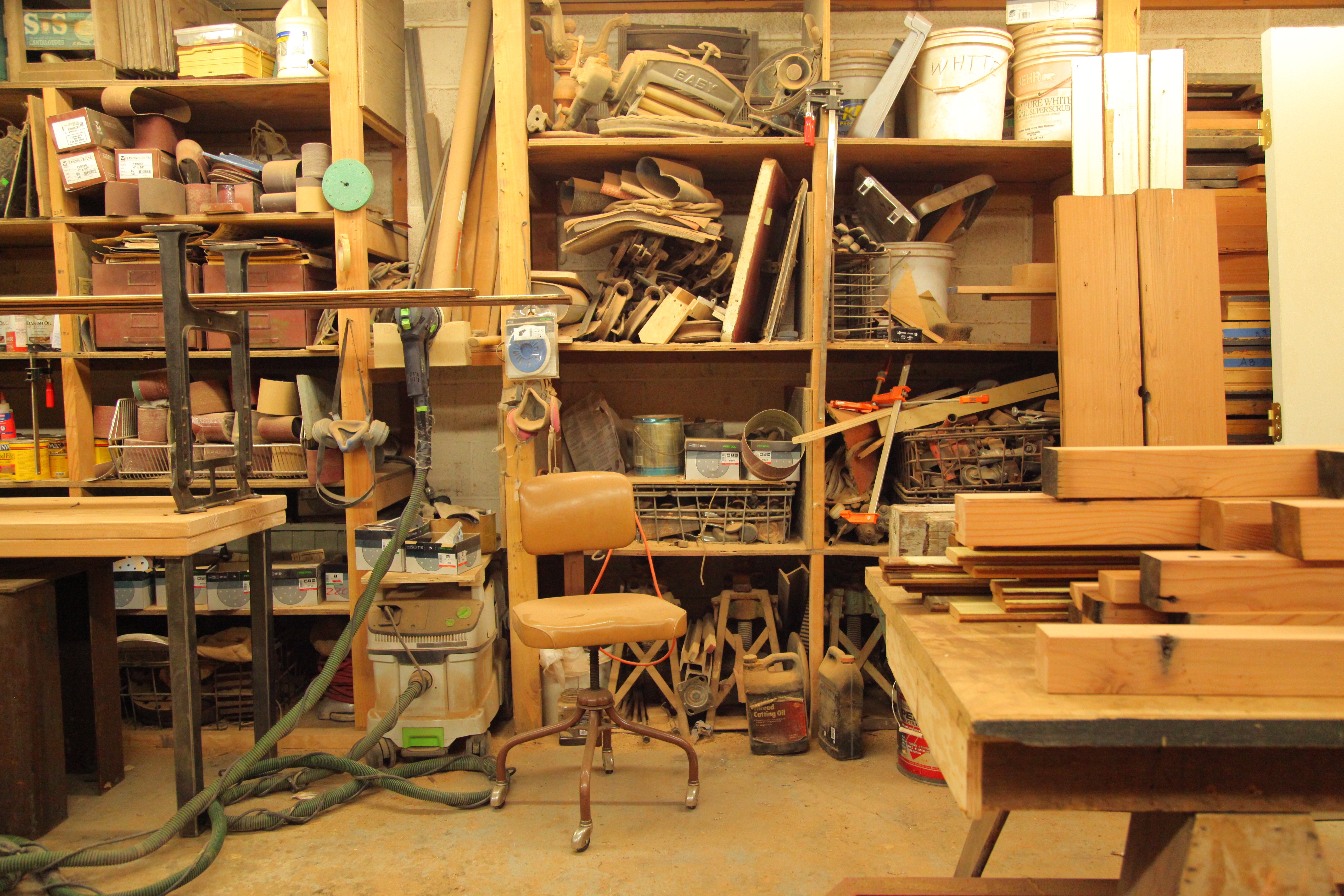 This warehouse was a 4,600 square foot empty shell when Appleton moved in six years. He’s built a maze of rooms on two levels, lined with rows of measured shelves holding sets of wood slats, 2x4s next to 4x8s next to 8x12s, like with like. The wood is organized by kind: redwood, doug fir, mahogany, pine, maple, oak and cherry, plus some rare black locust from somewhere in the Midwest. There are trashcans filled with pulp, plus stacks of paint cans, piles of rusted tools and paperwork on every countertop. Appleton lives upstairs with his white cat Sasha behind a door hung with a “wrong way” street sign.
