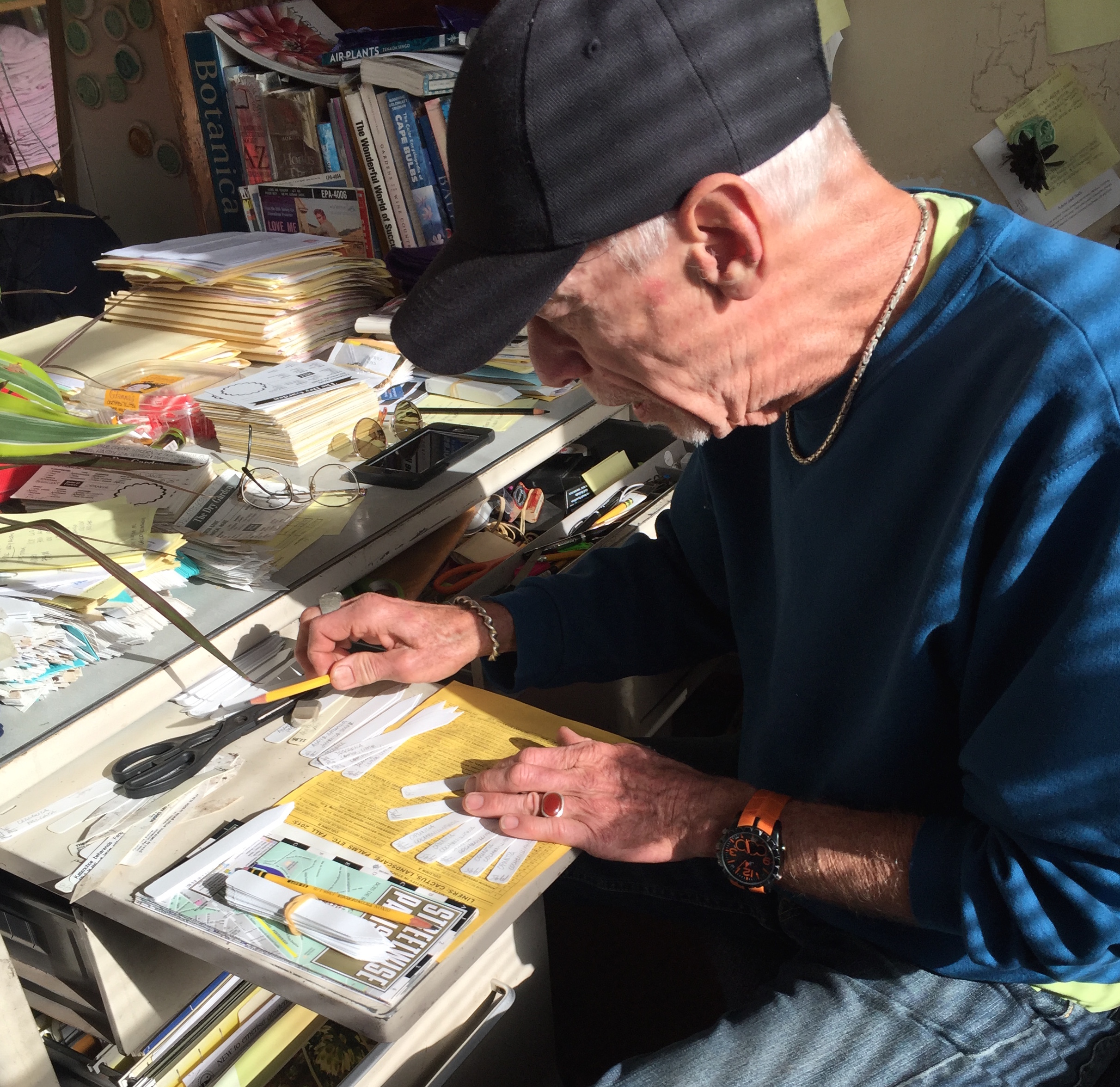 - Richard Ward writes out plant labels at his office in The Dry Garden in Oakland.