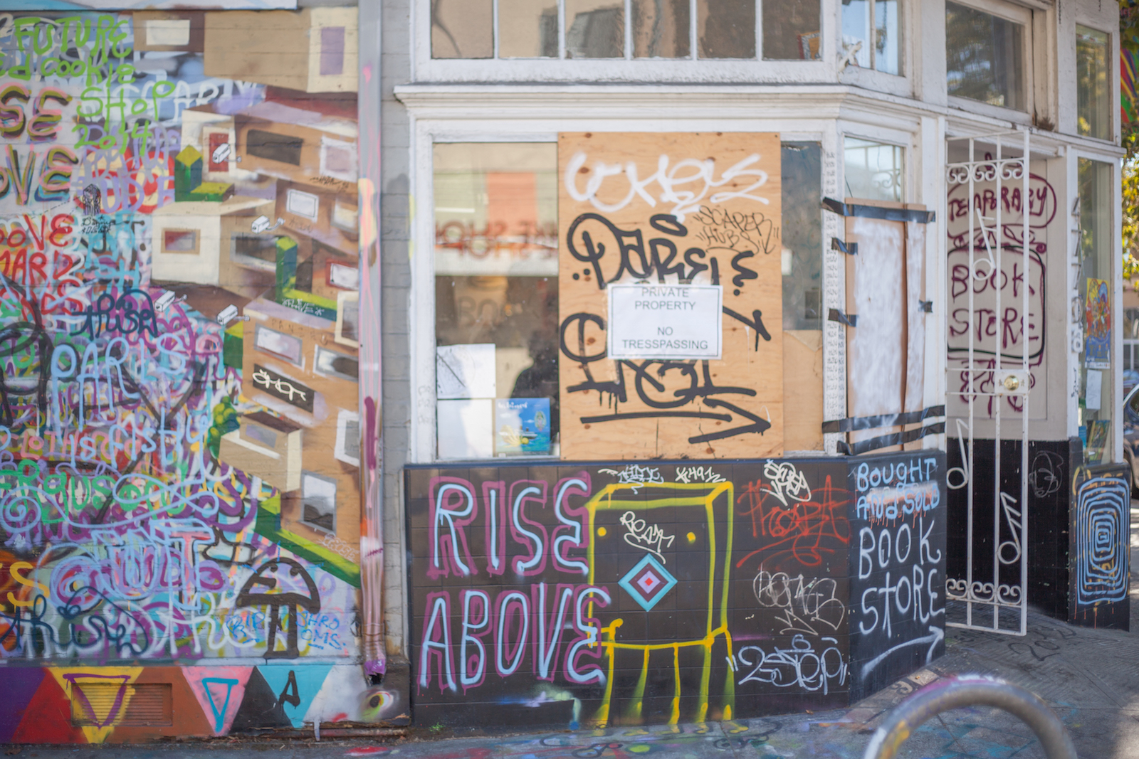 - Abandoned storefront on Telegraph Avenue in Oakland.
