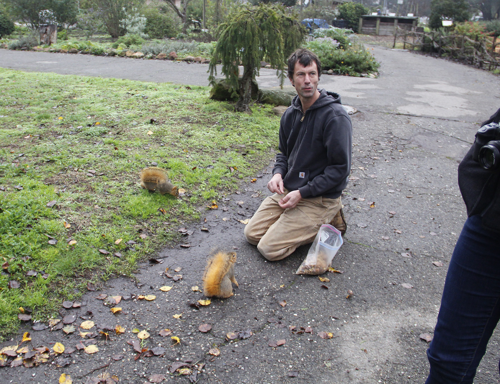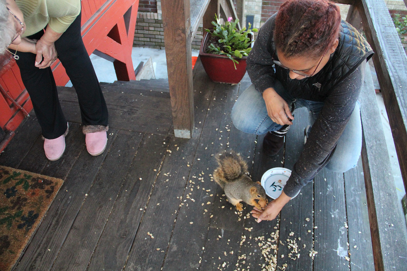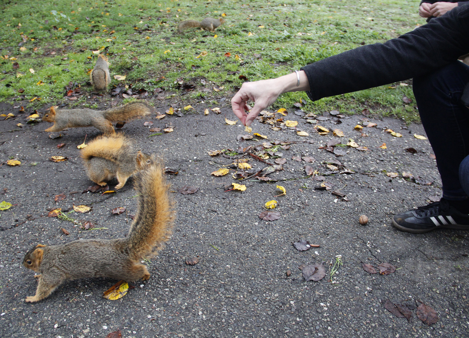 A woman in pink exercise clothes walks up to the scene with a bemused expression on her face. “You’re feeding the squirrels?” she asks.