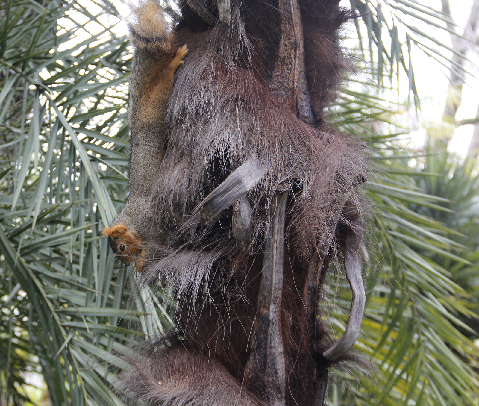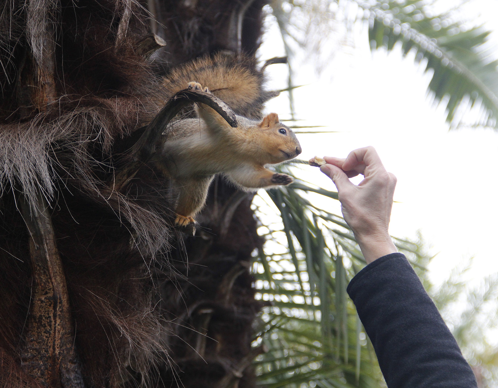 - A squirrel accepts a walnut from a lofty palm tree perch.