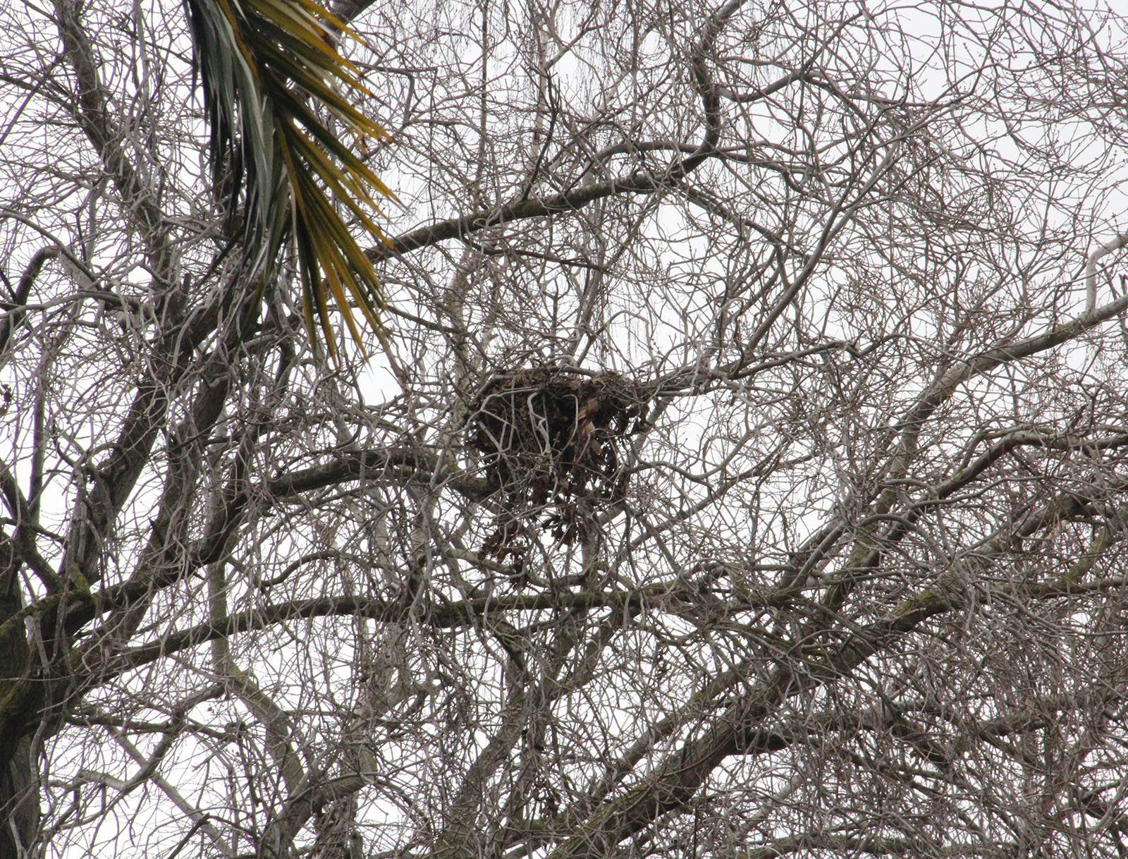 - A squirrel nest is barely visible in the higher branches of the palm grove at the Lake Merritt gardens.