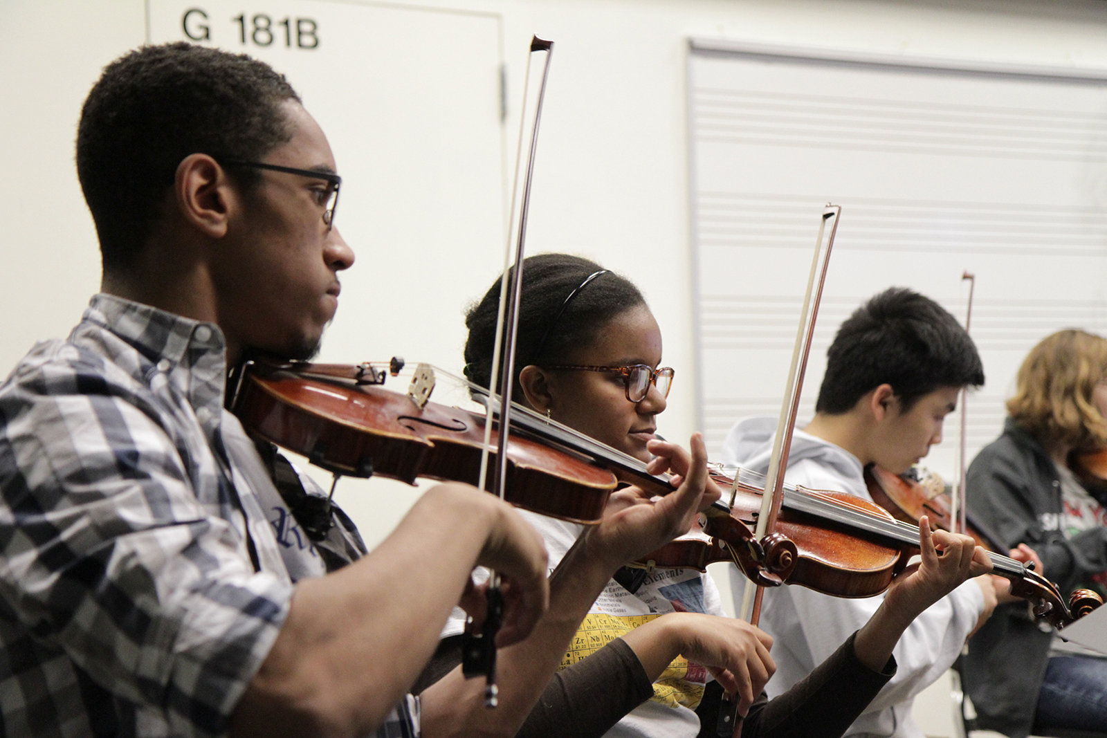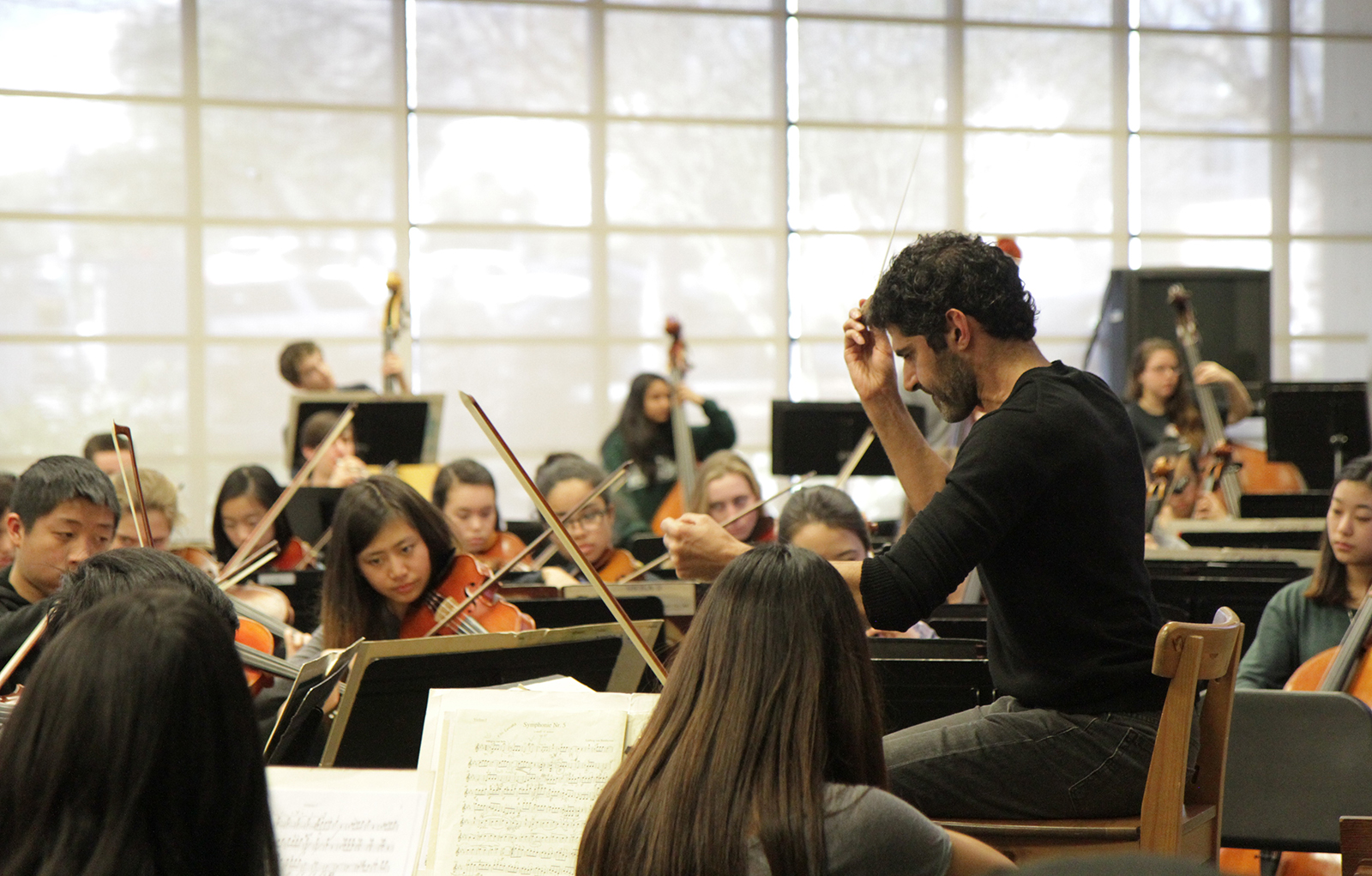 - Violinists Matthew Major, Casadora Boone and Daniel Lei rehearse Beethoven’s Symphony No. 5 in C Minor.
