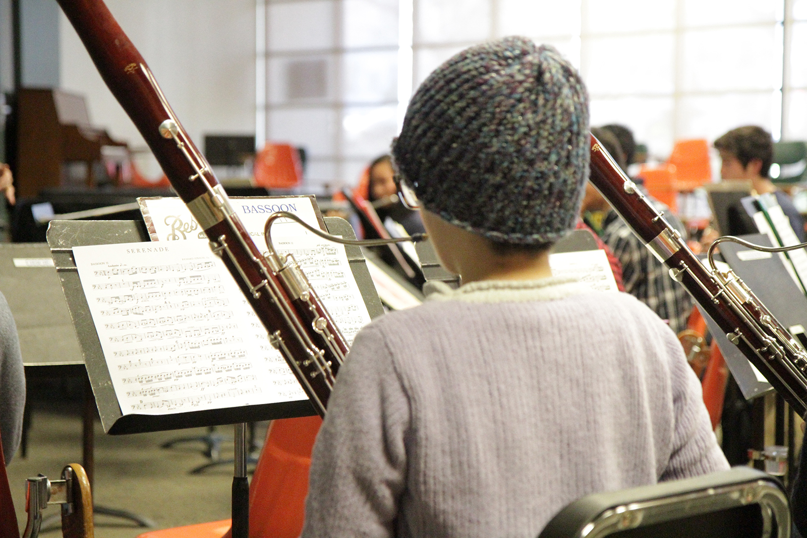 - Lita Gee plays along on the bassoon during woodwind rehearsal.