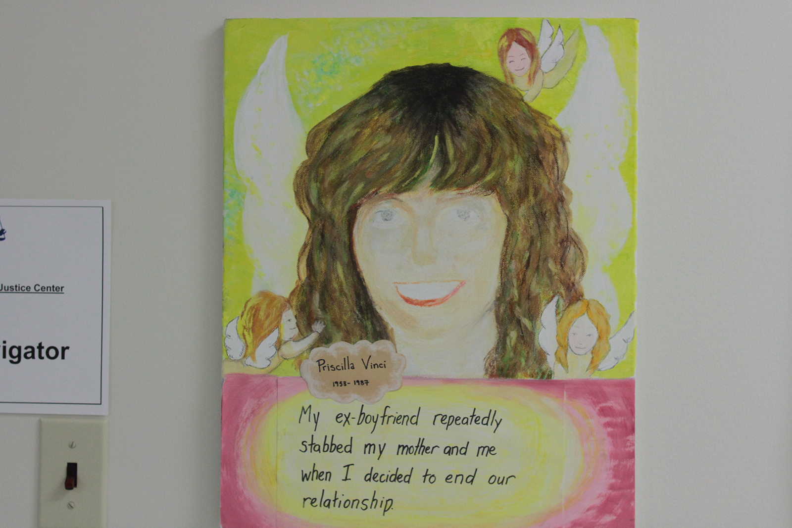 Violence against this community can be very serious. Paintings hang outside the DeafHope office, each one memorializing a woman who murdered by an abuser. To the far left, woman with blue eyes and dirty blonde hair beams out at passersby, framed against a yellow-green and pink background. Angels flutter around her head, white wings arching from her back and underneath her chin a golden cloud holds the caption, “Priscilla Vinci 1953-1987.” Below it is a quote: “My ex-boyfriend repeatedly stabbed my mother and me when I decided to end our relationship.”