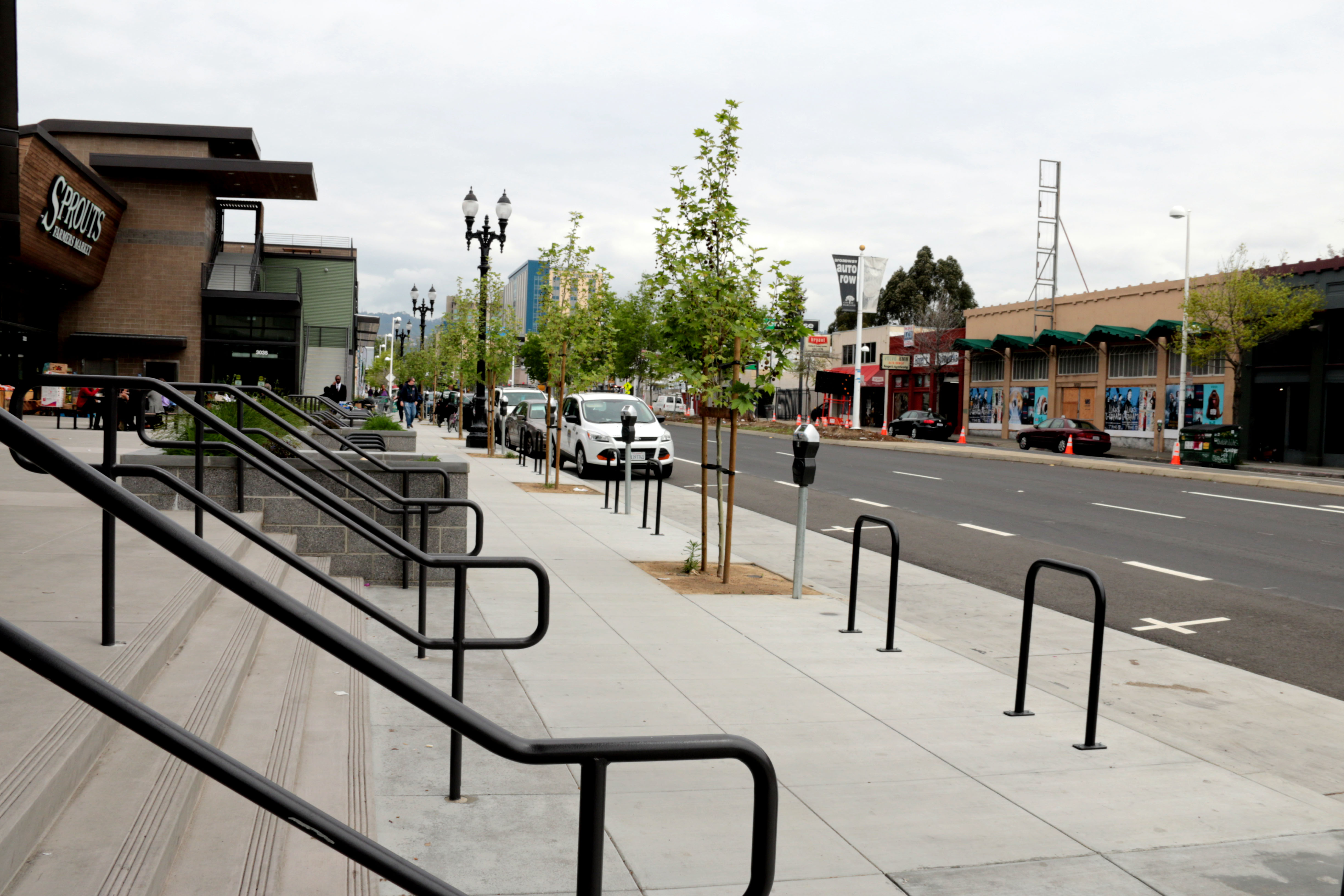 The southbound 51A bus stop, previously on the northwest corner of the Broadway and 30th Street intersection in Oakland, was removed early last year when construction of the Sprouts grocery store began. The store is now complete, but the bus stop is still gone. In its place are parking meters lined up on Broadway.