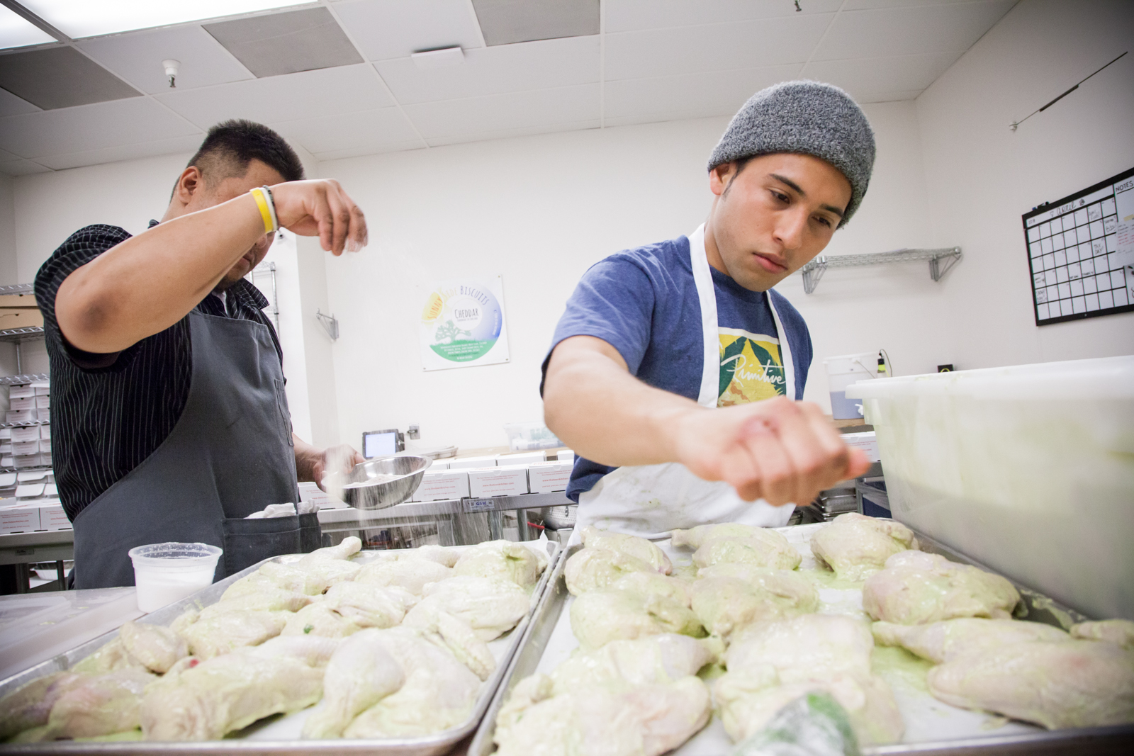 The kitchen on the third floor of The Port Workspaces in downtown Oakland has been bustling with life since six in the morning. Isaiah Rivera moves swiftly from one counter to another, packing food into white boxes and neatly aligning them across the metal countertop. In the back, his colleagues are marinating chicken thighs and cooking them over a high fire.