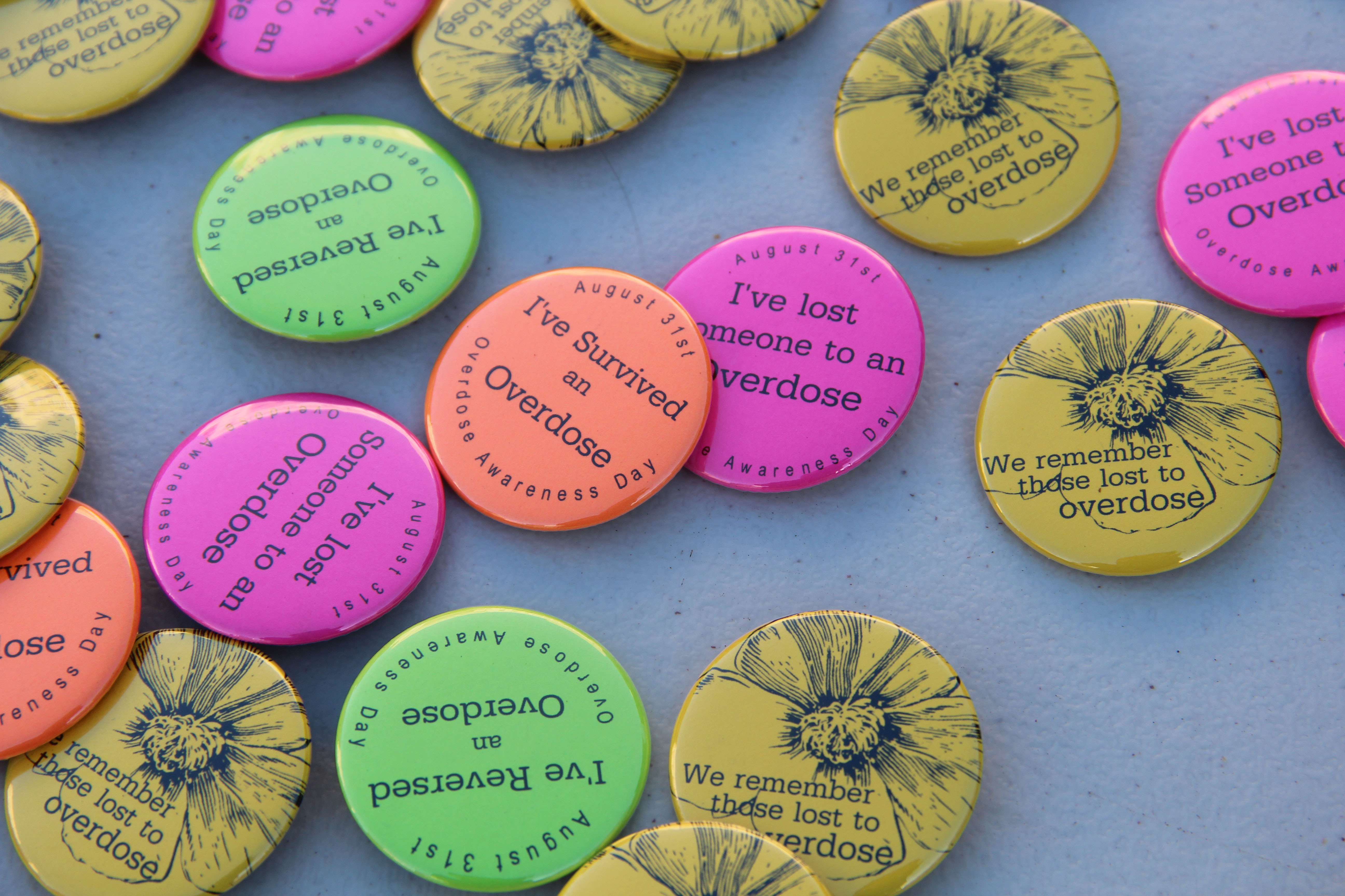 - Buttons sit on a table Wednesday at Frank Ogawa Plaza during Oakland’s first year participating in International Opioid Awareness Day.
