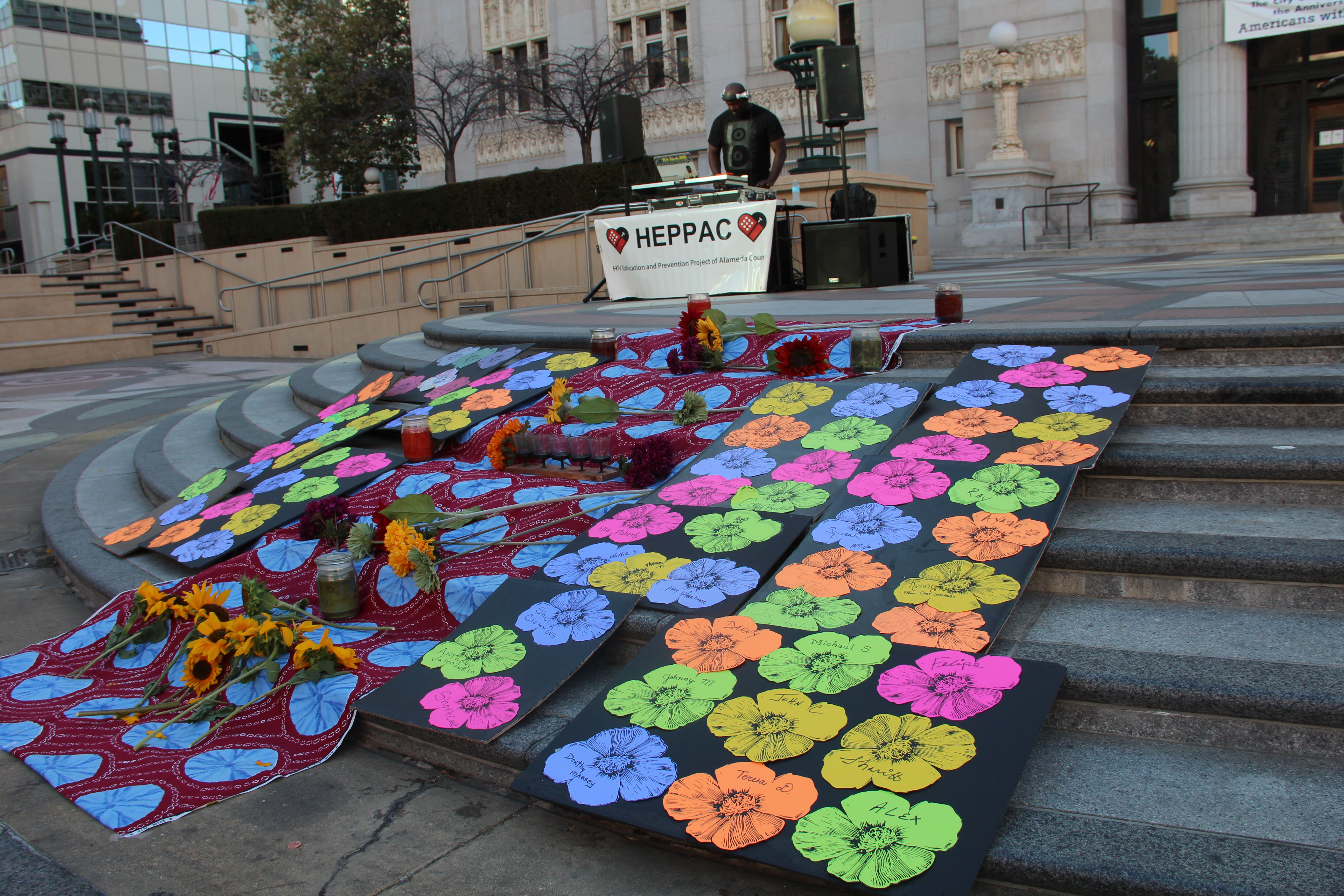 - A DJ plays music from artists who died of drug overdoses behind a paper flower memorial Wednesday at Frank Ogawa Plaza during Oakland’s first year participating in International Opioid Awareness Day.