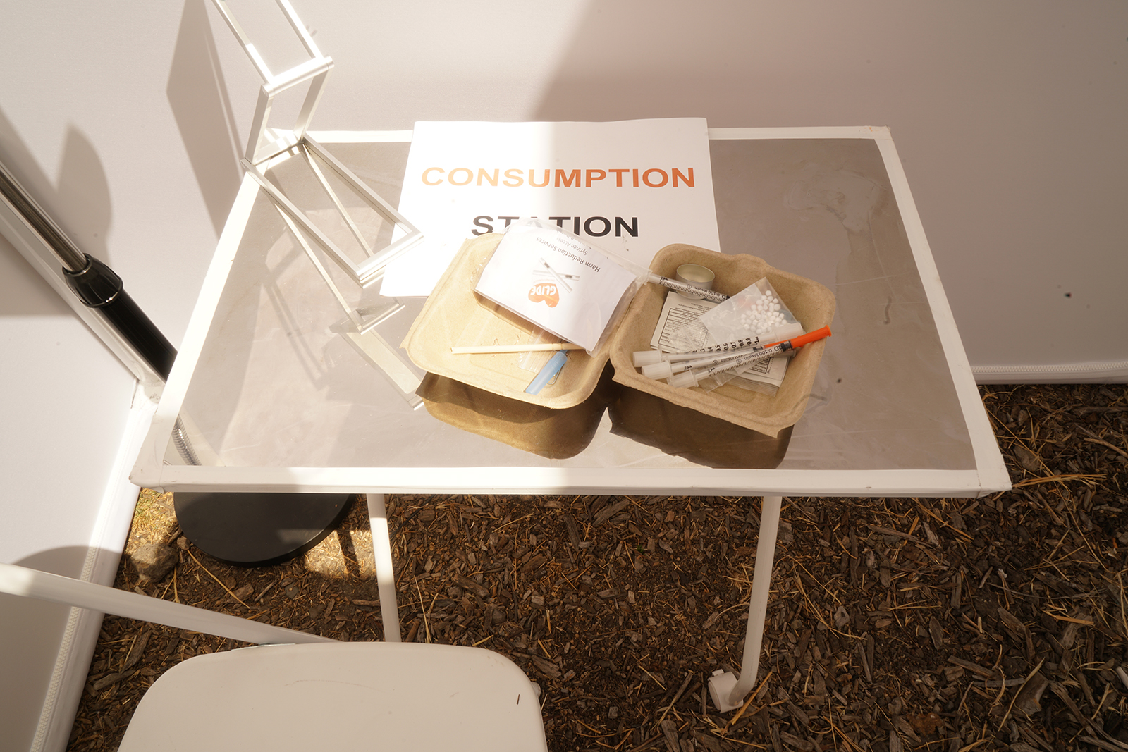 - The contents of a user’s sterile kit, displayed in the consumption station of this mock Supervised Injection Facility.