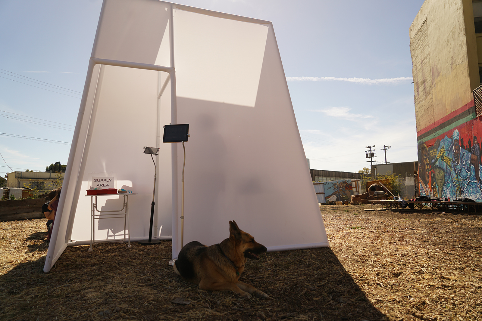 Courtney, the policy director at HIV Education and Prevention Project of Alameda County (HEPPAC), makes a neat bag of syringes and supplies and hands it over, then points to a bold white structure nearby. “Check that out,” he says. “It could be a possibility really soon.” He’s gesturing toward Safe Shape, a small pop-up prototype of a Supervised Injection Facility.