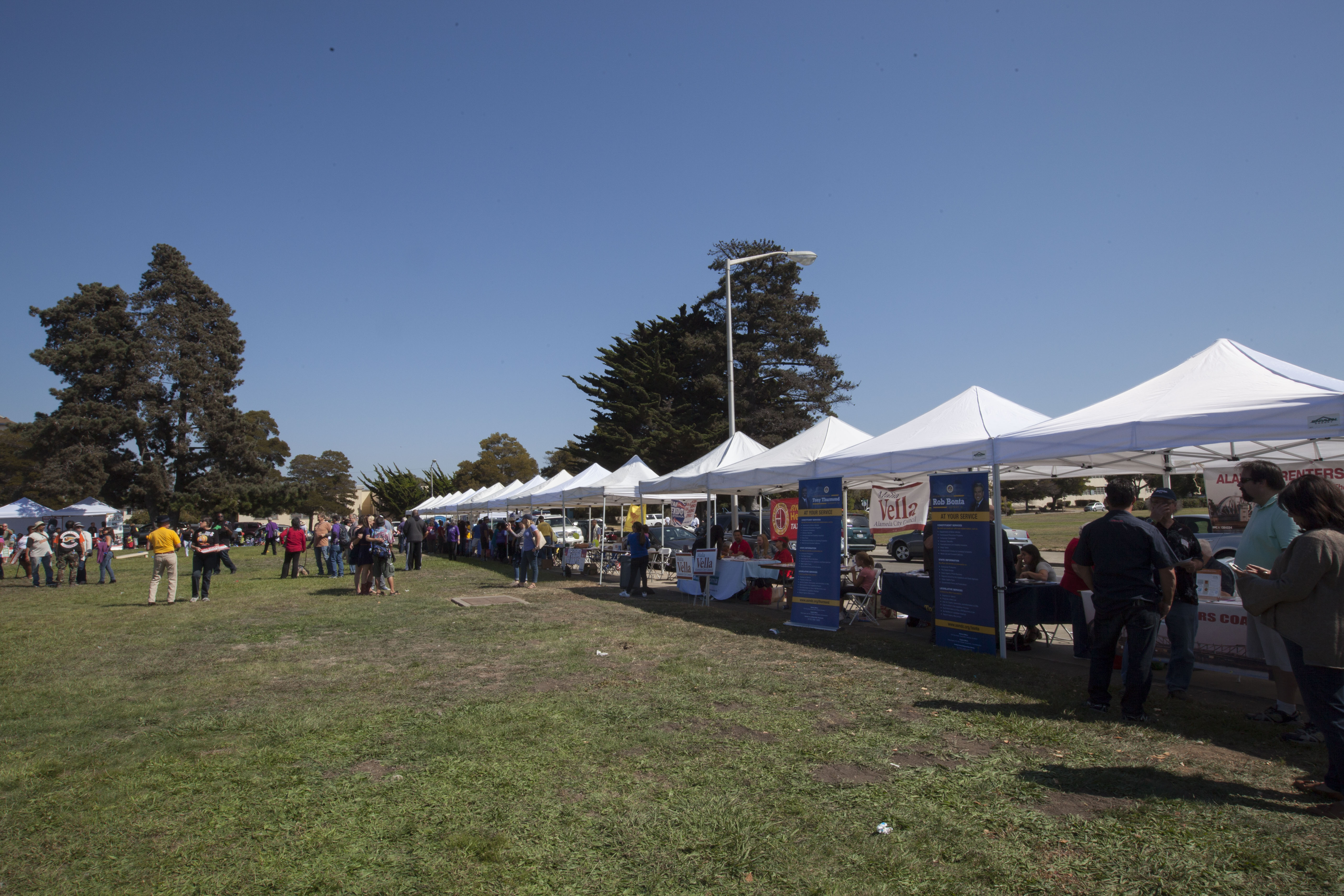 Balloons floated above the white tents organizers had set up on the grassy field. Fire fighters served the free lunch. Members of the Bakers Union gave away union-made cookies, Red Vines and Ghirardelli chocolate. Some people tossed beanbags while others played catch with a tennis ball. A band, Isaiah, played on a stage set up in front of a Teamsters big rig.