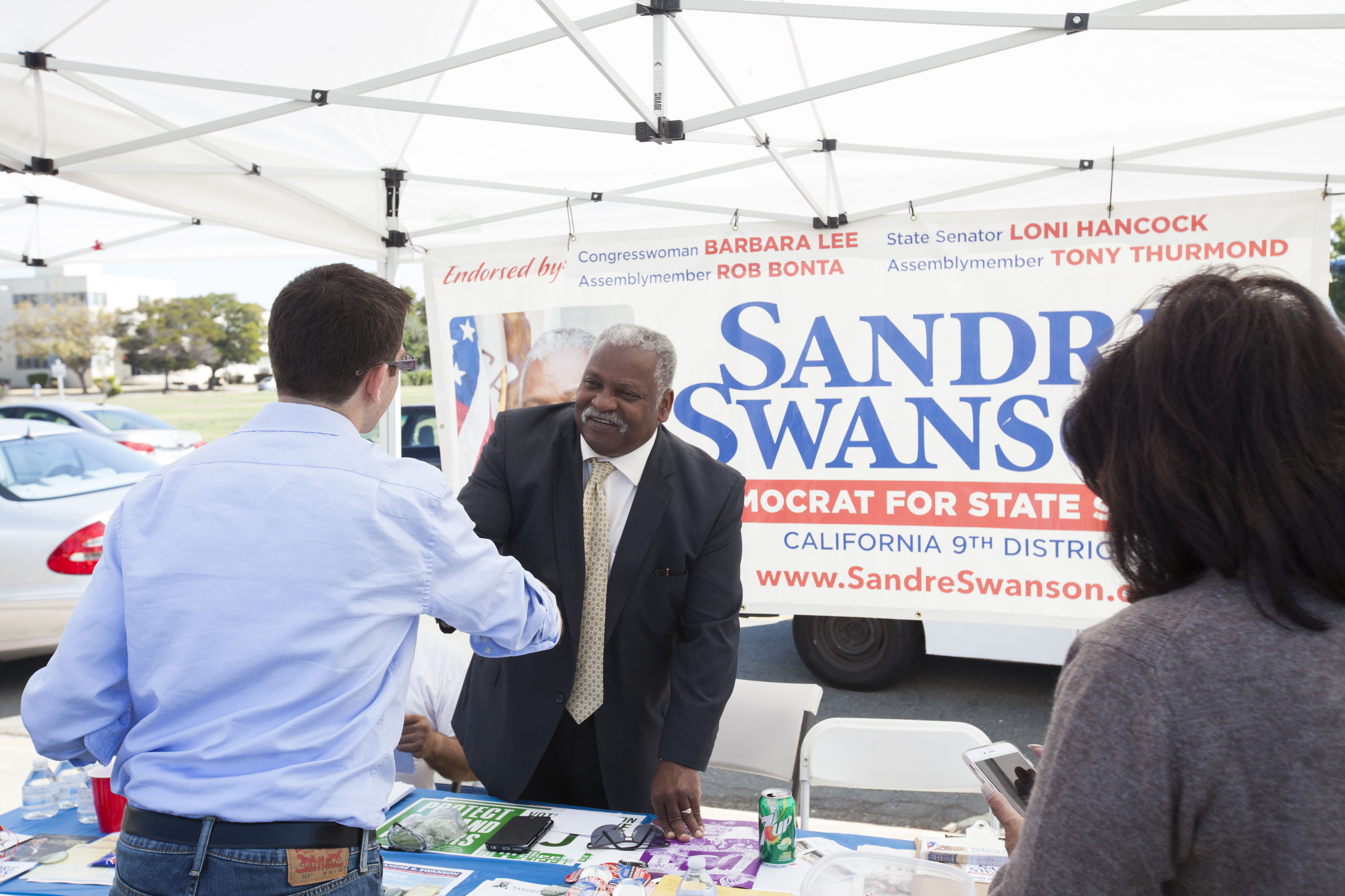Anita Swanson, wife of Sandré Swanson, a Democrat from Oakland running for state Senate in the Ninth District in November, stood in front of the campaign’s tent greeting people that walked by with a brochure and a message.