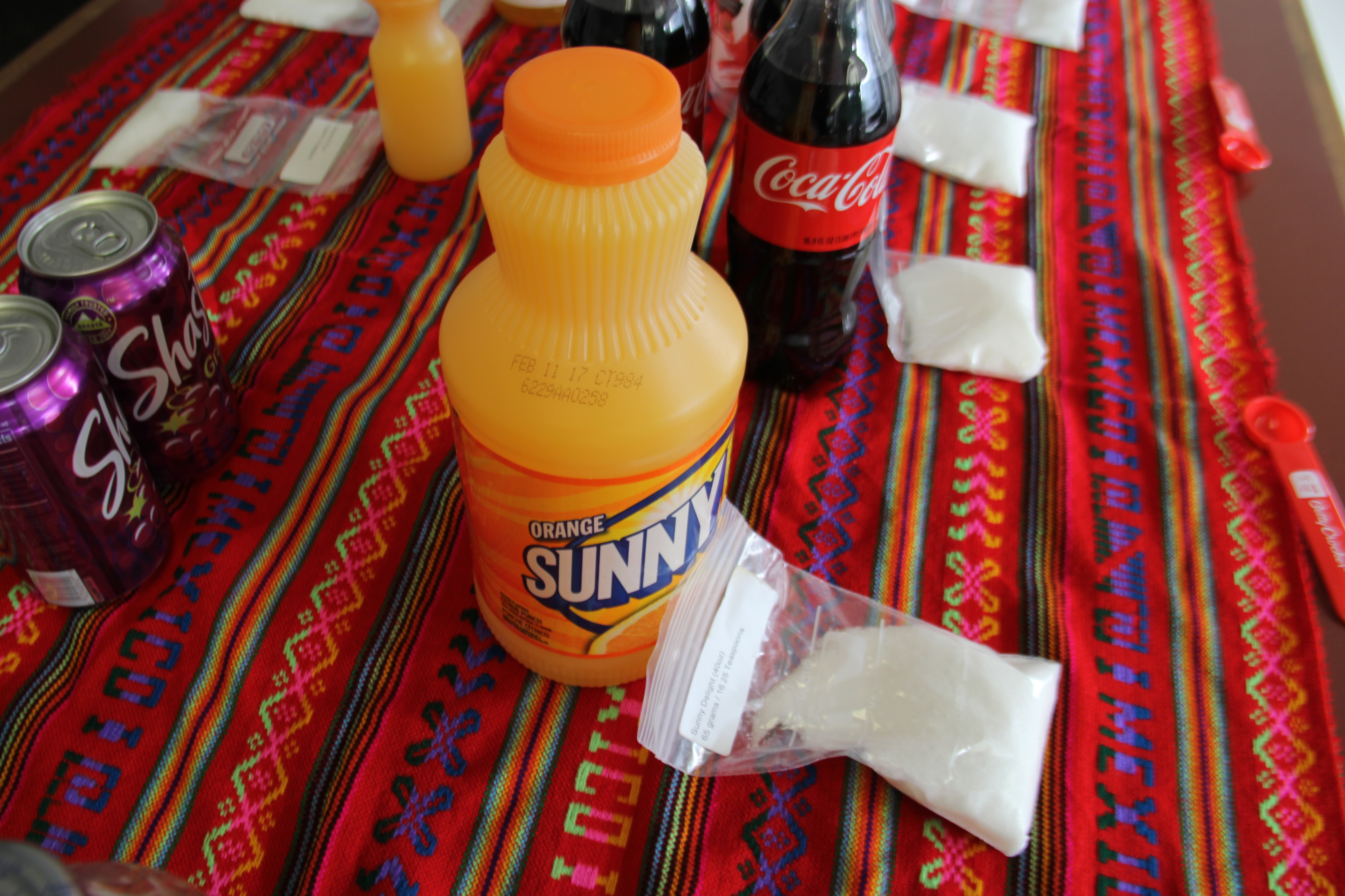 - At the Oakland v. Big Soda campaign headquarters, a demonstration shows how much sugar is in a bottle of Sunny D orange juice.