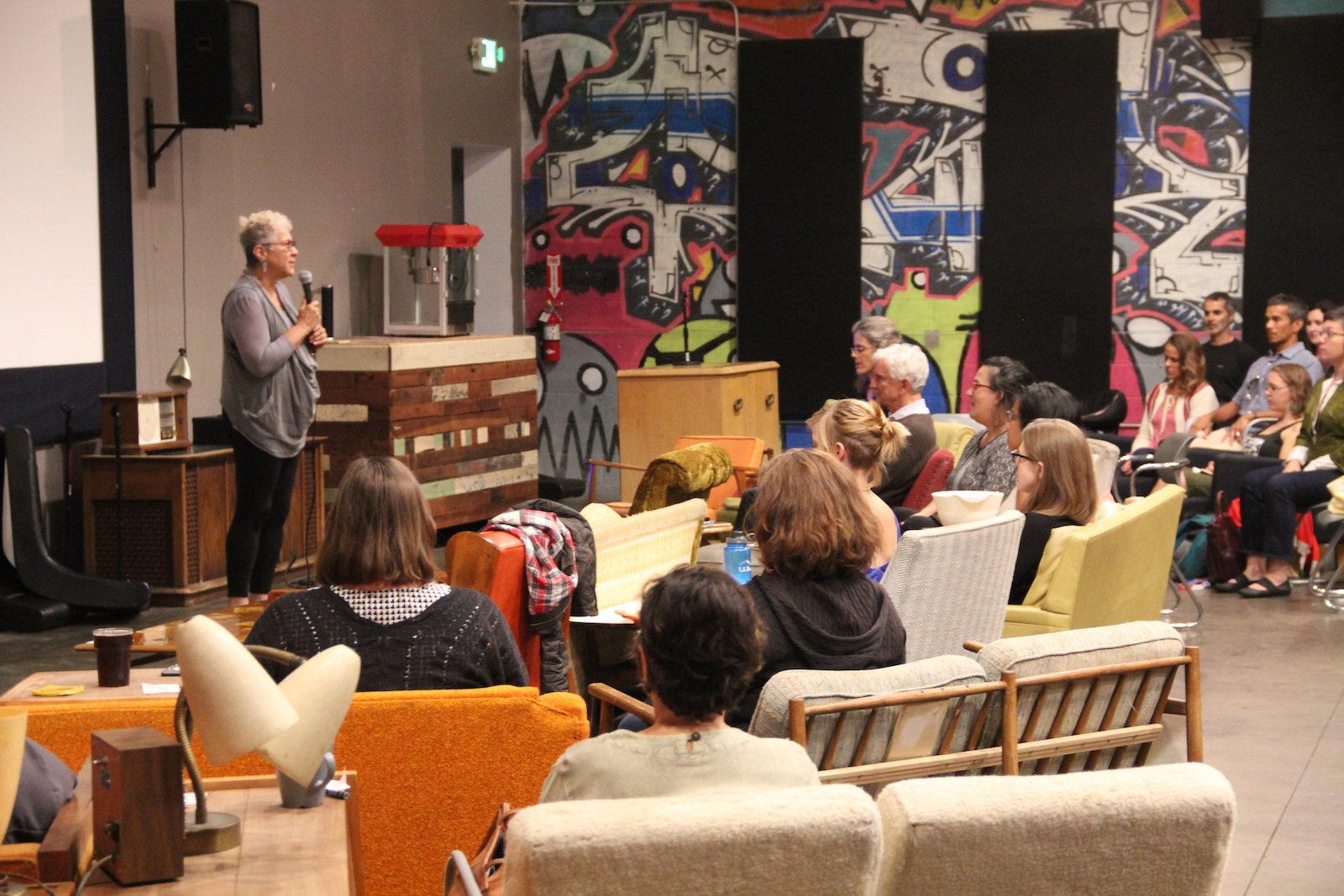 - Filmmaker Shakti Butler addresses the audience before the screening of her documentary Mirrors of Privilege: Making Whiteness Visible.