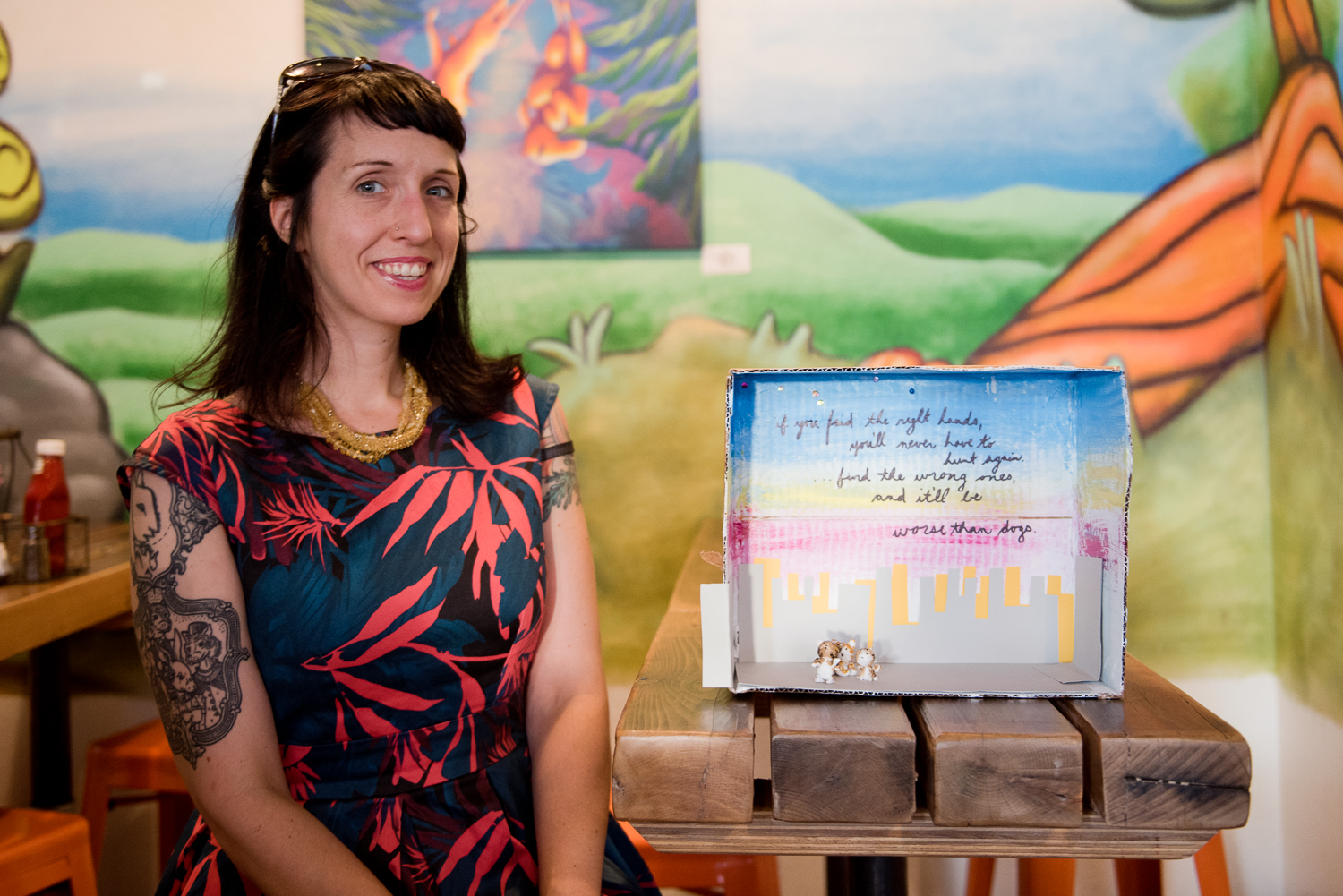 - Amy Martin, cohost of the event, with her diorama of ‘Catwings’ by Ursula K. Le Guin. Photo by Rosa Furneaux.