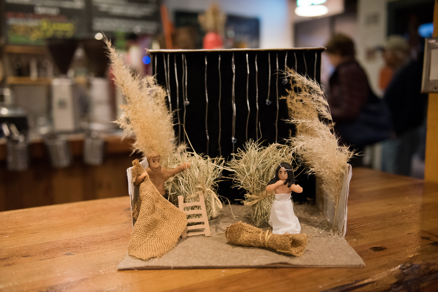 To the right of Wings’ diorama sat Hayley Bennett’s, portraying a scene from Far from the Madding Crowd. In the scene, a thunderstorm threatens protagonist Bathsheba’s barn, so her love interest, a shepherd named Gabriel, comes to save the haystacks. Bennett used clear beads hanging from wires to depict rain, small clay models that she baked in her oven for Bathsheba and Gabriel, and hay bought from a local pet store for the bales. She won the “most quasi-biblical” award.