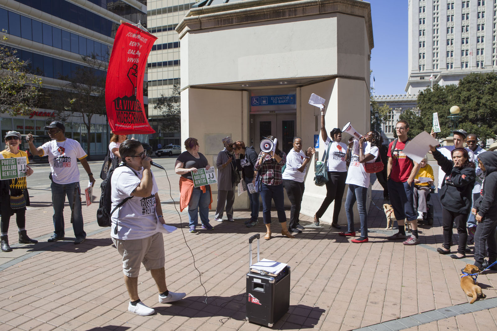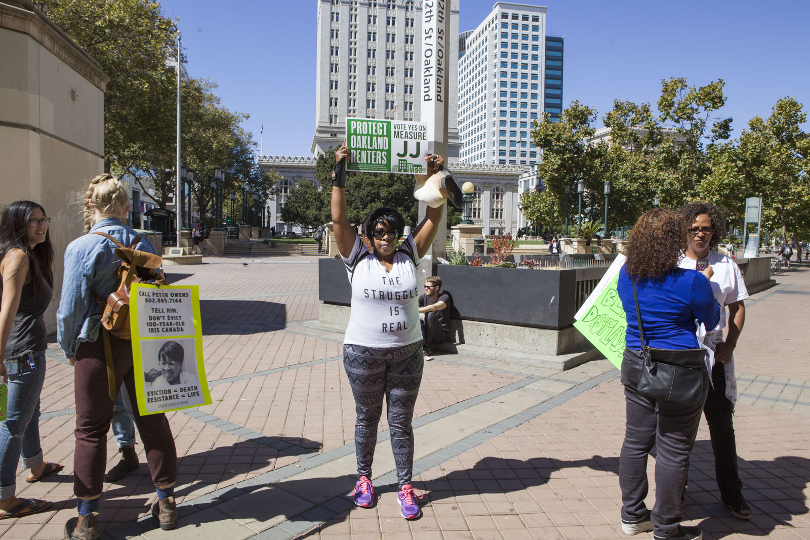 - Demonstrators outside Oakland City Hall took part in the national Renter’s Day of Action.