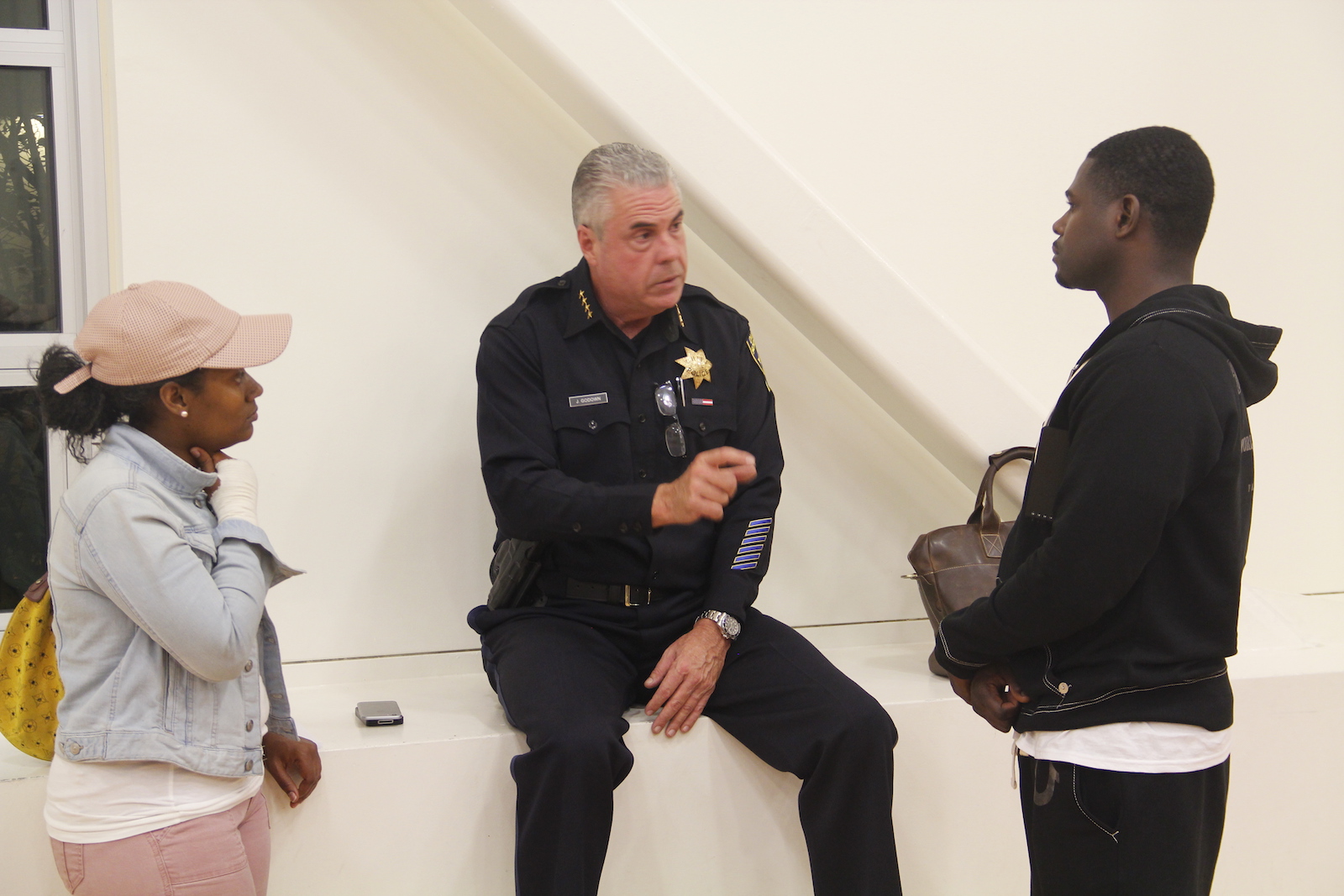 - OSPD Chief Jeff Godown speaks with Yolanda Richardson and Don Taylor, who are concerned for student safety after their daughter was recently approached twice by a stranger as she walked between campuses at Oakland Technical High School. Photo by Cassady Rosenblum.