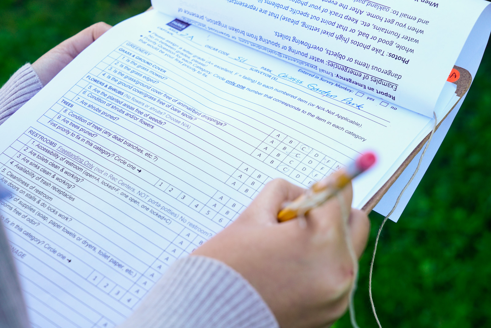 - An Huynh and Susan Nguyen, 16, inspect the Chinese Garden Park in Oakland to survey for existing problems as part of Love Your Parks Day on Saturday, October 1, 2016. The survey ratings are charted and comments are evaluated for an end of the year report given to the Oakland City Council and a powerpoint is presented to the Public Works Committee. (Yesica Prado/Oakland North)