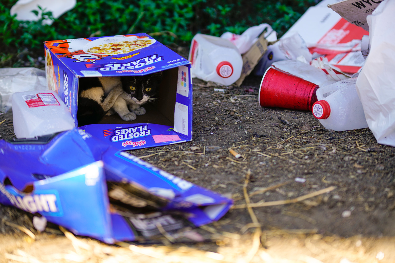 - A stay cat hides inside a Frosted Flakes cereal box at the Chinese Garden Park on Saturday, October 1, 2016. Trash and feces are a common sight on the park, luring in stray cats in search for food. (Yesica Prado/Oakland North)