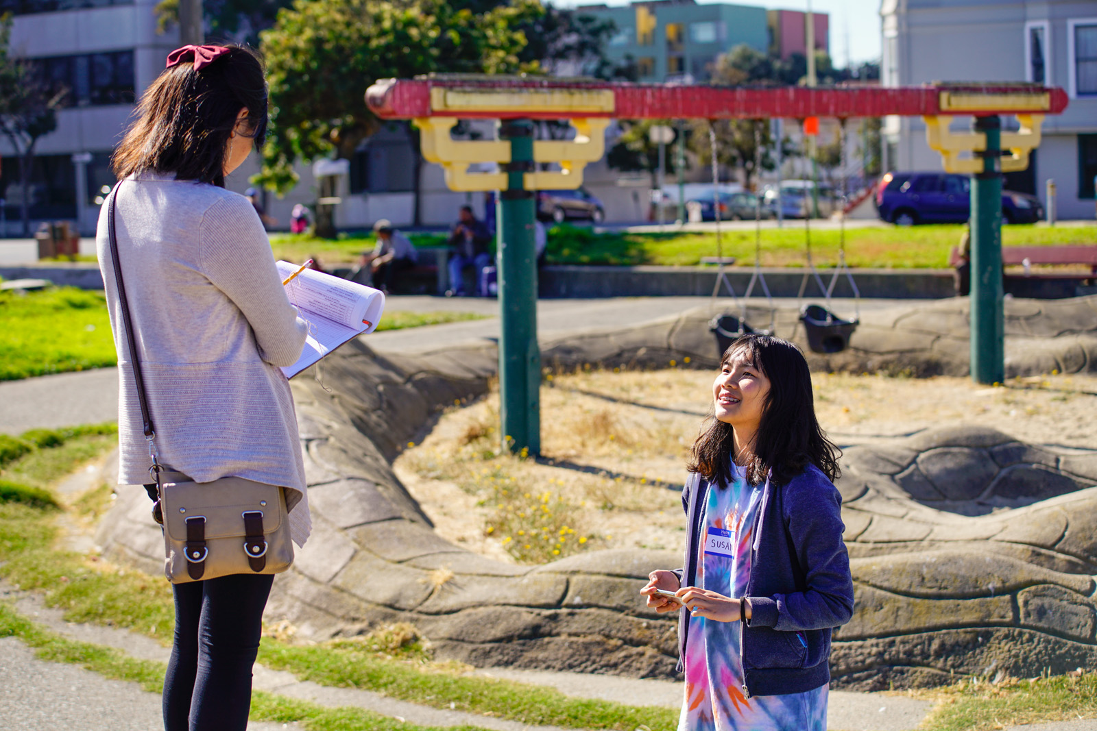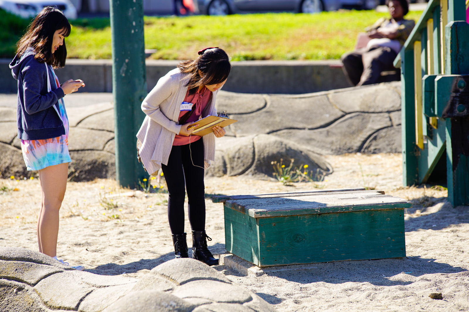 - Susan Nguyen, left, and An Huynh, right, inspect the children’s playground for damages and safety hazards at Madison Square Park in Oakland on Saturday, October 1, 2016. (Yesica Prado/Oakland North)