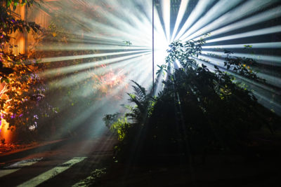 - Light beams of faint flowers spread across the darkness and artificial smoke in the art installation “Rhododendron chronon” created by artitsts Chris Macklin, Joshua Erickson, Allison Vanderslice, Elizabeth Blackburn, Andy Highland, and Mike Bissell at the Autumn Lights Festival in Oakland on Wednesday, October 12, 2016. (Yesica Prado/Oakland North)