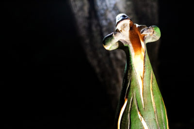 Doris Saben is one of 30 ceramics artists from Laney Community College whose pieces are showcased throughout “Mud Garden.” Situated around the garden’s Ripple Fountain, the collection of ceramic sculptures are named after the clay used to make the pieces. A trail of lanterns fashioned out of glass jars with the names of each artist lights the way through the oval enclave that is framed by plants and trees. According to Saben, her piece—an illuminated, open-chested ceramic figure—is a “symbol of opening up and letting frustration come out,” that reflects her frustration “with the whole world.”