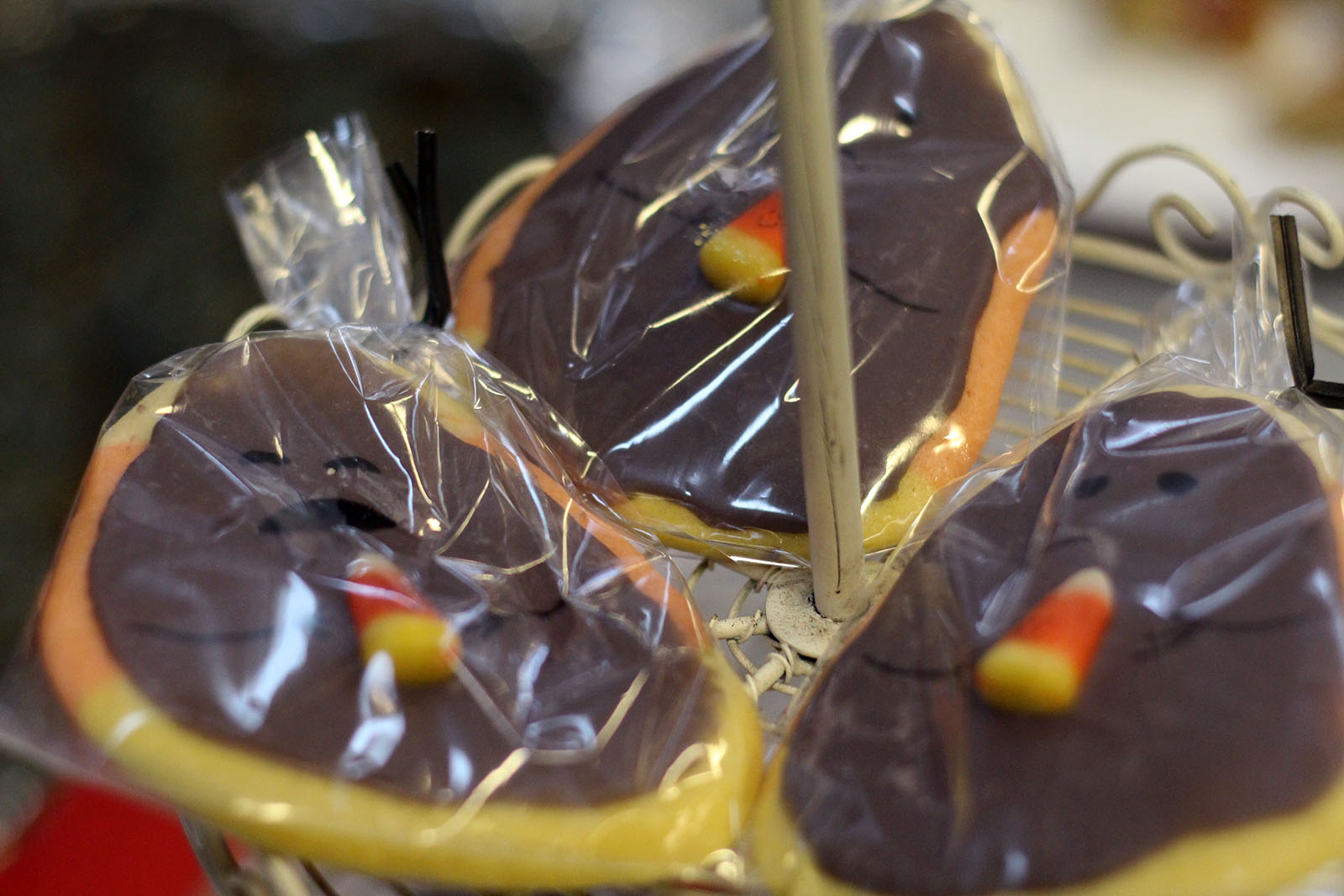 For sale were cookies, cupcakes, donuts, cakes and other baked goods, baked by professionals and amateurs alike, some decorated simply and some more elaborately. On one table sat two plates brimming with heart-shaped sugar cookies, covered with charcoal-colored icing and silver sprinkles. Just behind these sat a three-tiered stand filled with about a dozen orange, yellow, and beige sugar cookies covered in gray icing. Literally sad, each cookie was decorated with a frowning face and arms that held a piece of candy corn, which in turn had a smiling face. On the opposite table sat an unwieldy six-layer cake, covered in thick, flower-shaped frosting in gradient shades of gray. As volunteers carefully cut it open, they revealed the cake’s rainbow-colored layers, separated by white frosting.