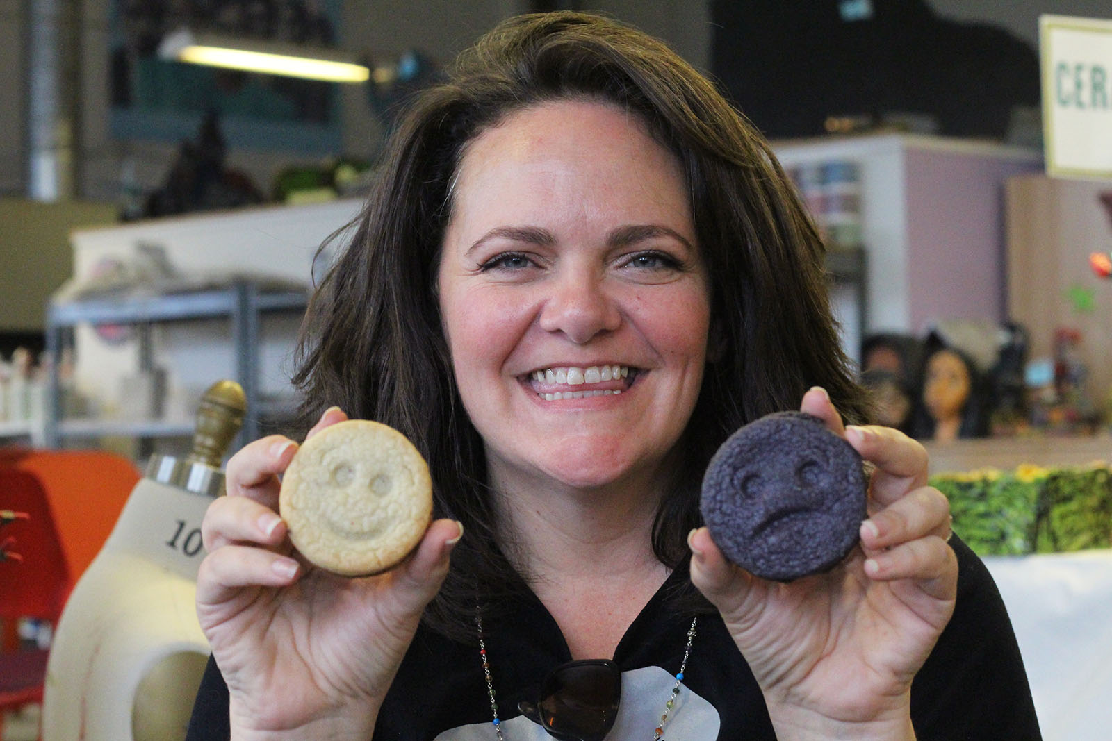 - Jane Reyes, one of the event organizers, holds up her shortbread, chocolate and caramel cookies. The happy-faced cookie is filled with caramel, with chocolate ganache neatly surrounding the entire cookie; the sad-faced one has caramel and ganache together. “So it’s all mixed up,” Reyes said, wordplay intended.
