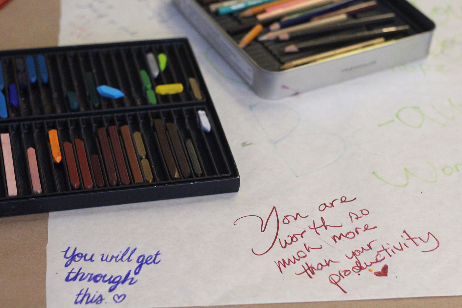 In addition to buying baked goods, attendees drew and wrote encouraging notes to themselves and loved ones at the drawing and letter-writing stations. On one of the tables lay a piece of paper with a drawing of a hand giving a thumbs-up next to a slice of the rainbow cake and a view of its gray exterior. Above this drawing, the artist wrote “You can do this!” On the nearby butcher-paper covered table, one note read, “Look for something POSITIVE each day, even if some days you have to look a little HARDER.”