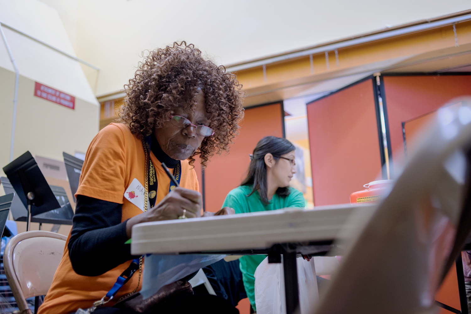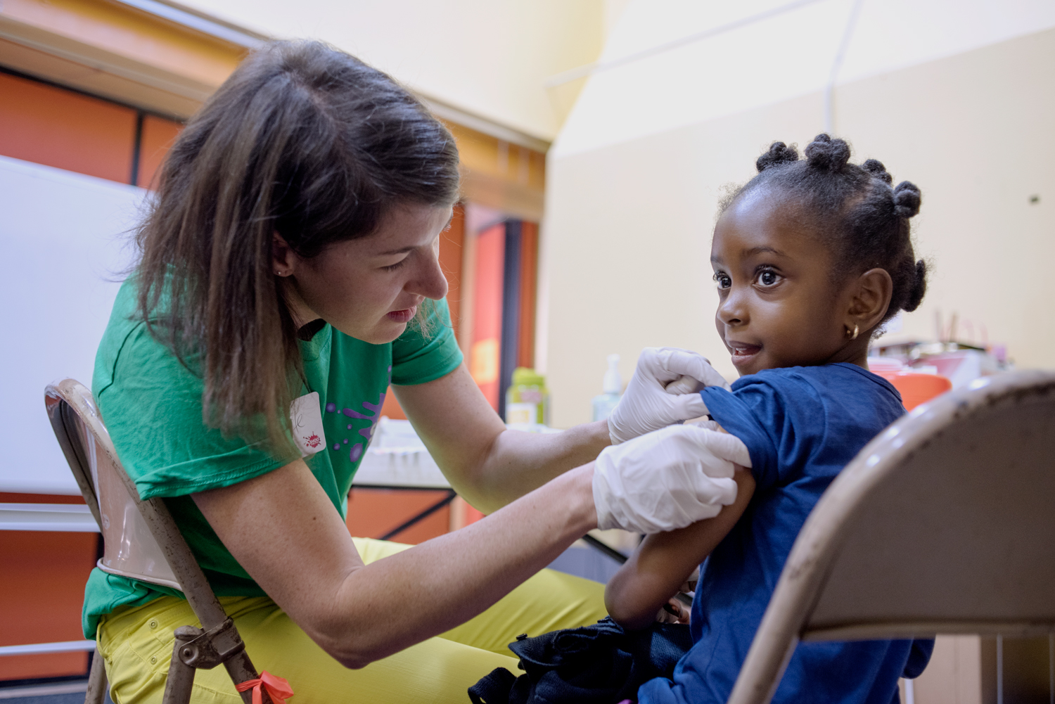 The room behind the screen is surprisingly calm. Three nurses are preparing surgical gloves, stacking cotton wool and organizing paperwork on fold-out tables. A collection of music stands have been pushed to the side of the stage to make room for this impromptu clinic. On the other side of the screen, a cluster of Cleveland Elementary second-graders clutching green forms wait nervously in the school dining hall. Kate Holbrook, equipped with a google-eyed stress ball and a broad smile, waves in her first patient.