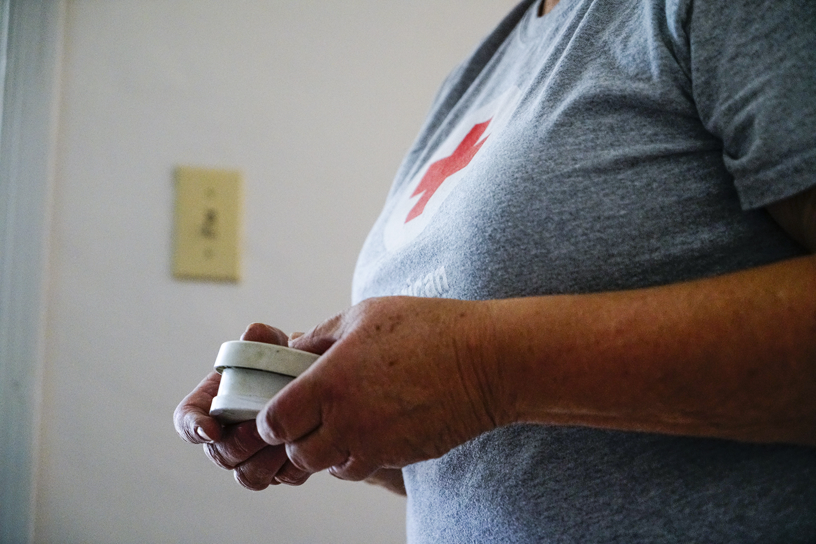 - An American Red Cross volunteer holds an old smoke alarm in her hands in Fruitvale, Oakland on Saturday, October 8, 2016. (Yesica Prado/Oakland North)