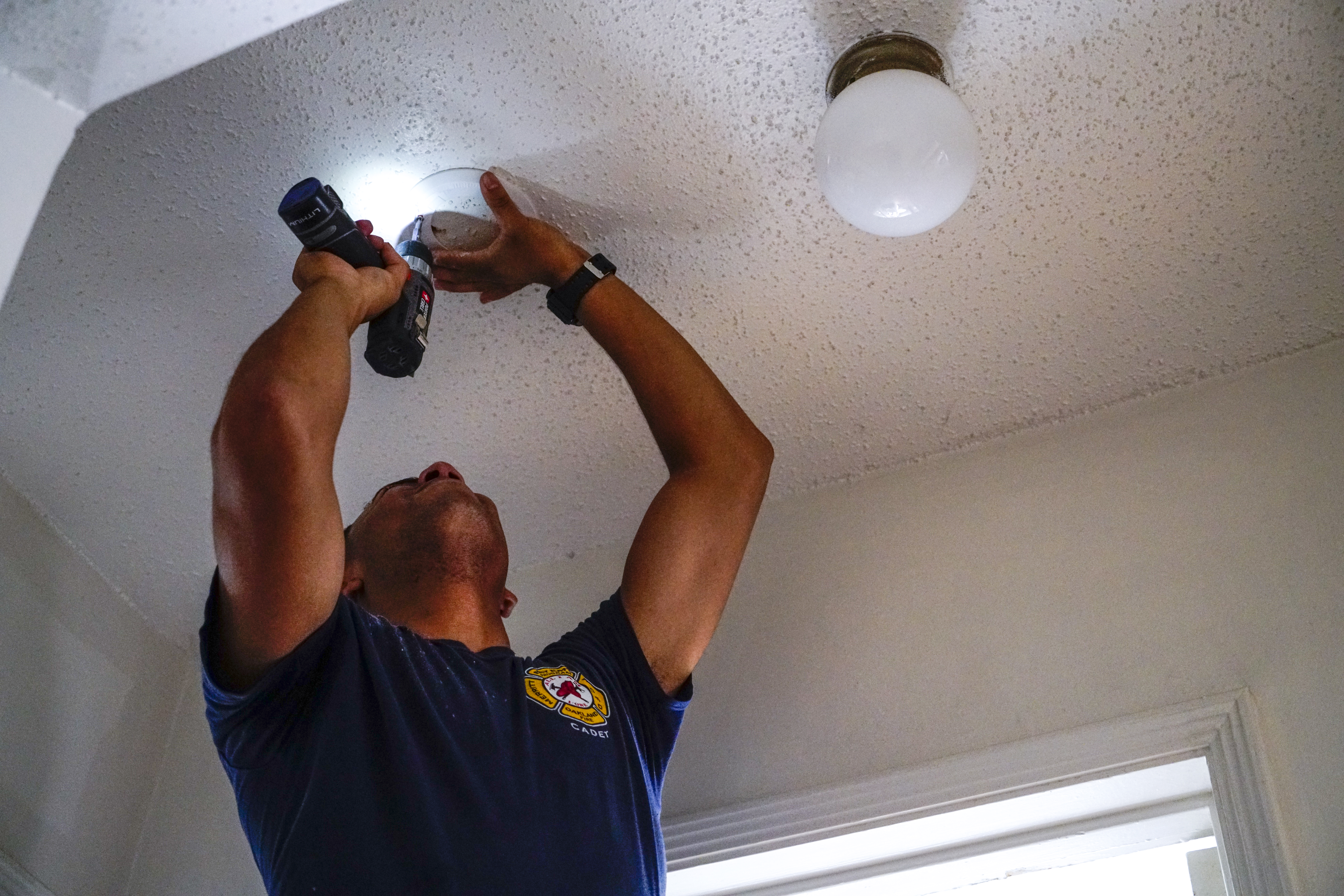 - Eduardo Robles drills a hole in the ceiling of a Fruitvale resident’s home to install a new smoke alarm as part of the Home Fire Preparedness Campaign on Saturday October 8, 2016. (Yesica Prado/Oakland North)